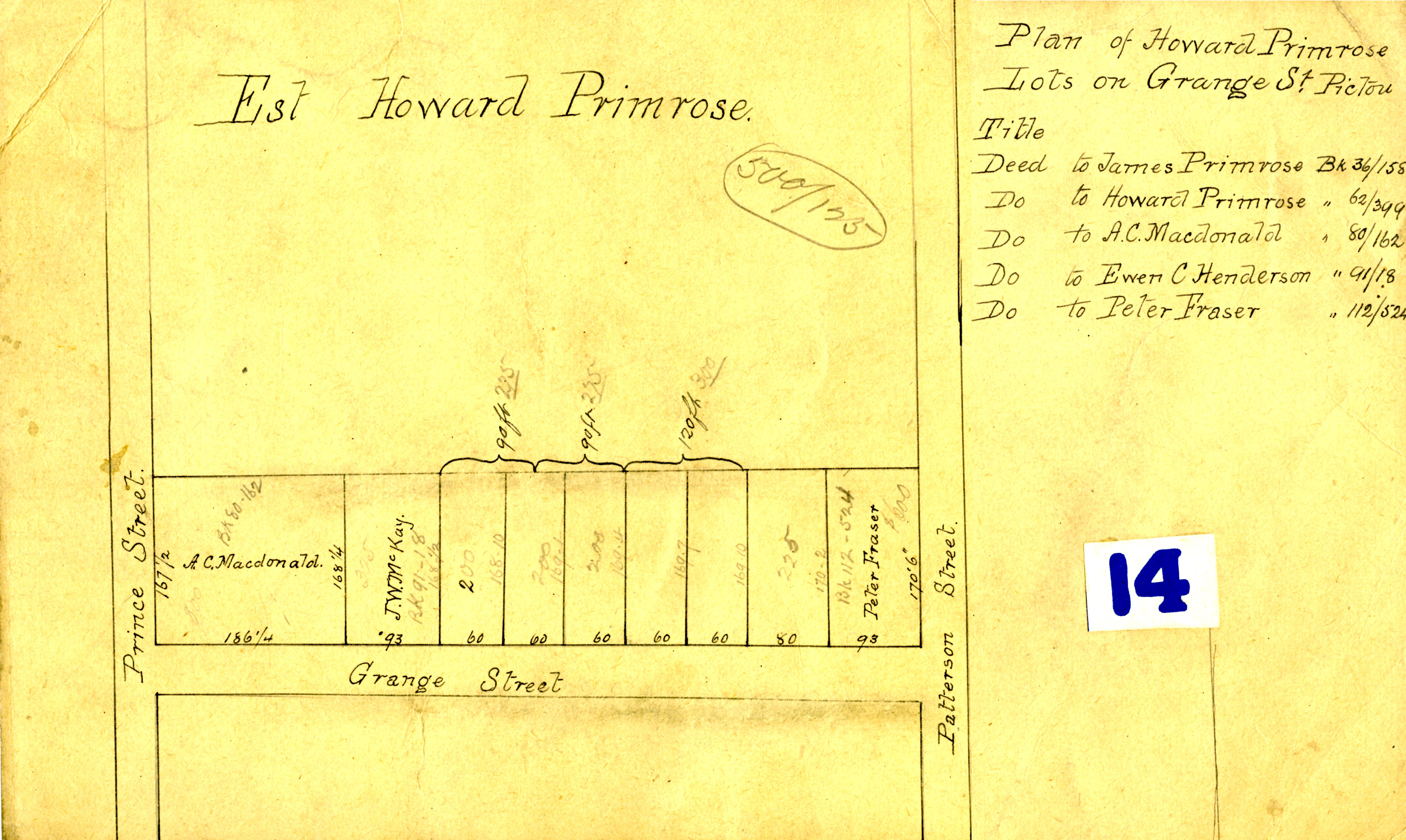 Plan of Howard Primrose's property (and its division) on Grange Street, dividing the land to James Primrose, Howard, A.C. McDonald, Ewen C. Henderson, and Peter Fraser