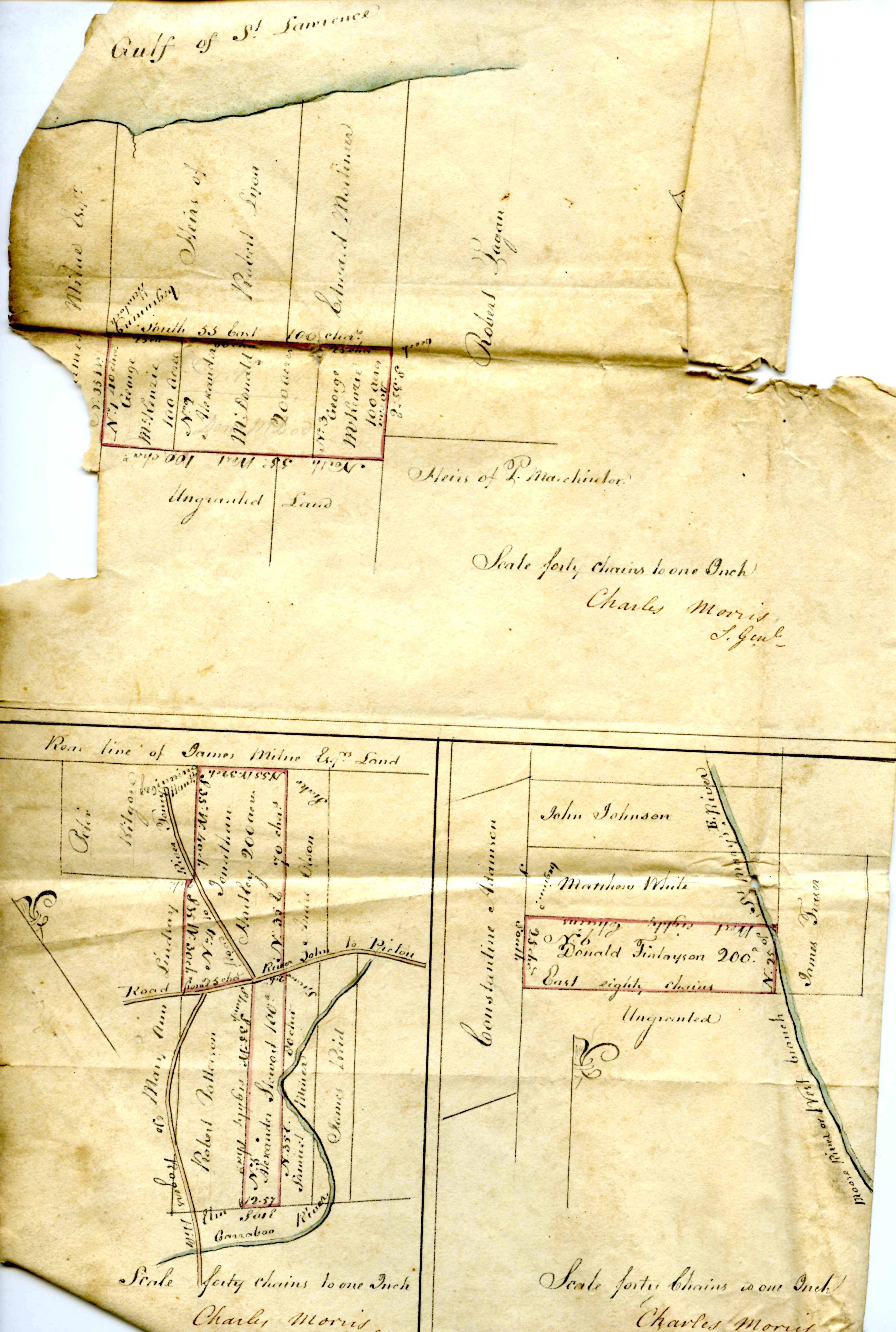 Edward Mortimer and Robert Logan properties along the St. Lawrence, James Milne land along River John Road, and varies properties along the West Branch river. Maps by Charles Morris.