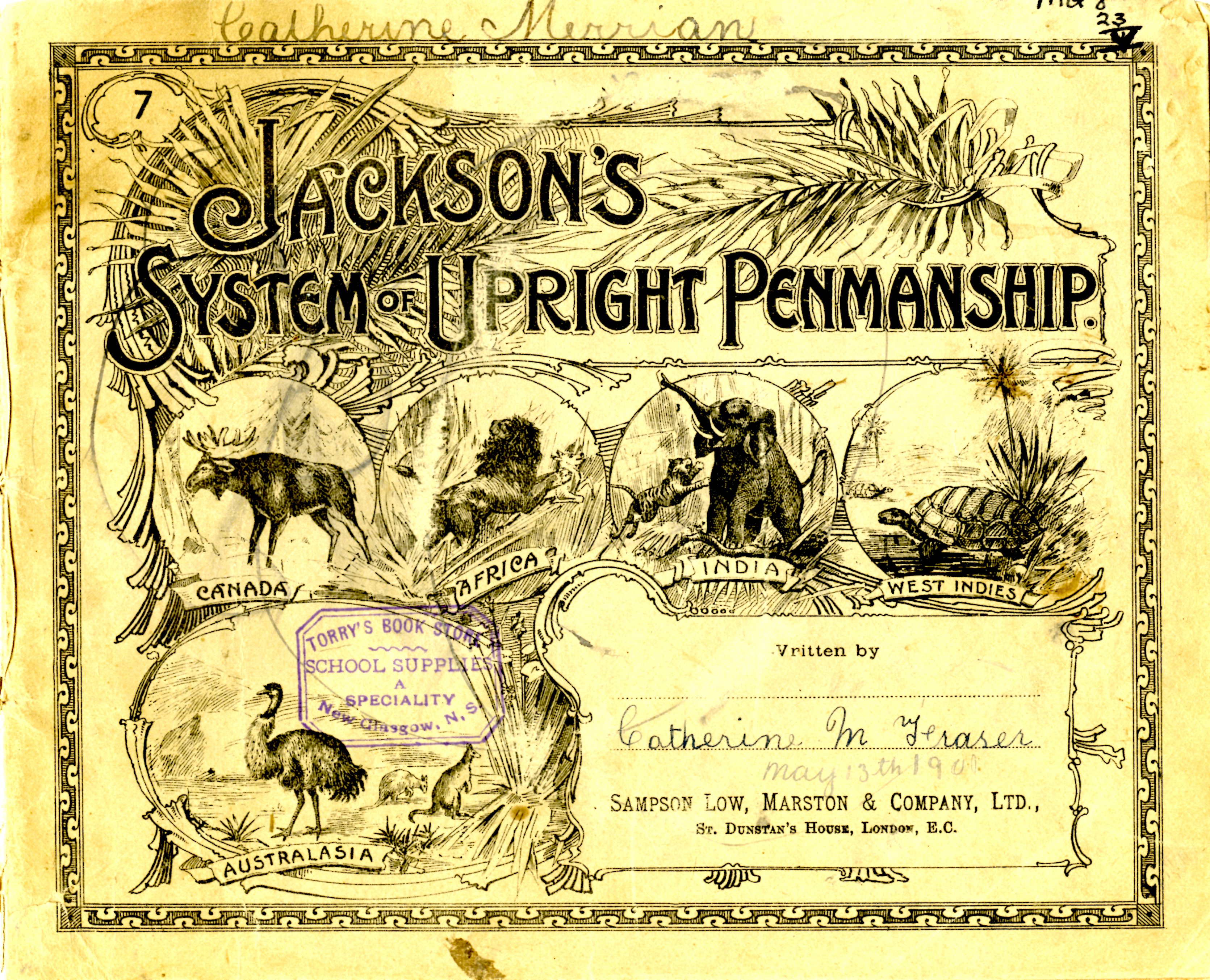 Cover of scribbler used in 1900 to teach cursive writing to children. Bought from Torry's Bookstore in New Glasgow, N.S., belonging to Catherine M. Fraser