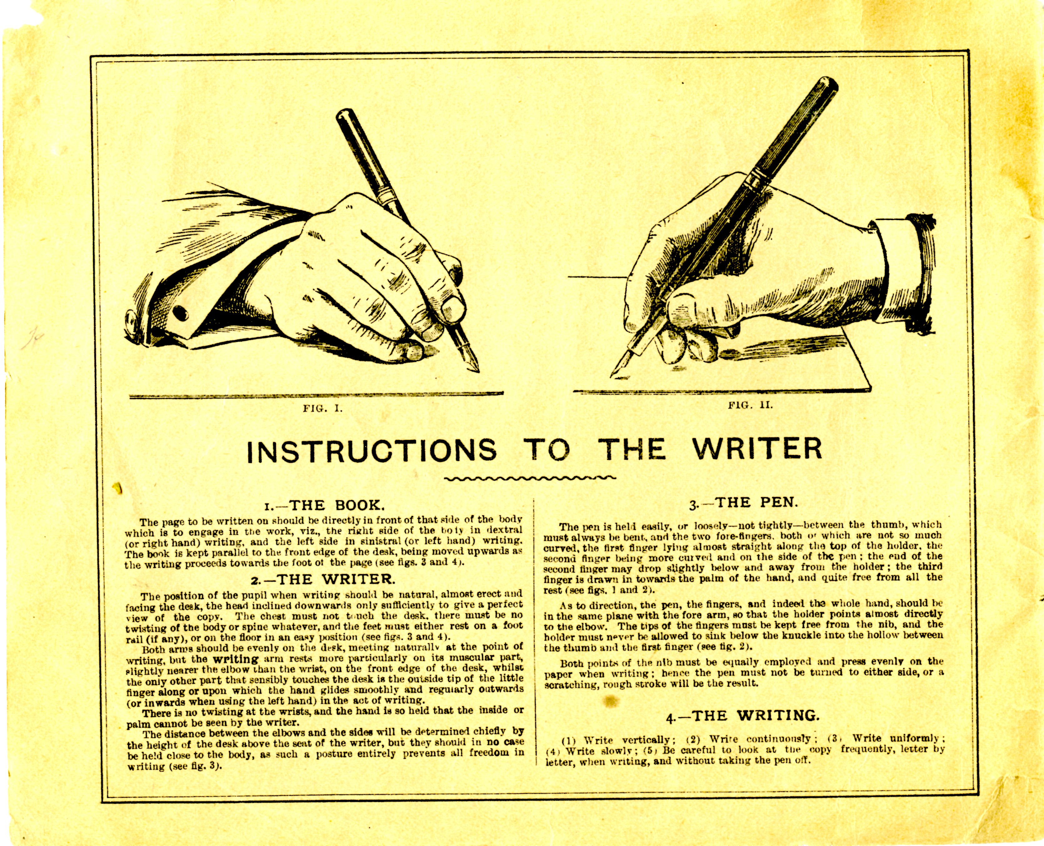 Instructions about the book, writing, pens, and general use of the 1900 penmanship scribbler of Catherine M. Fraser