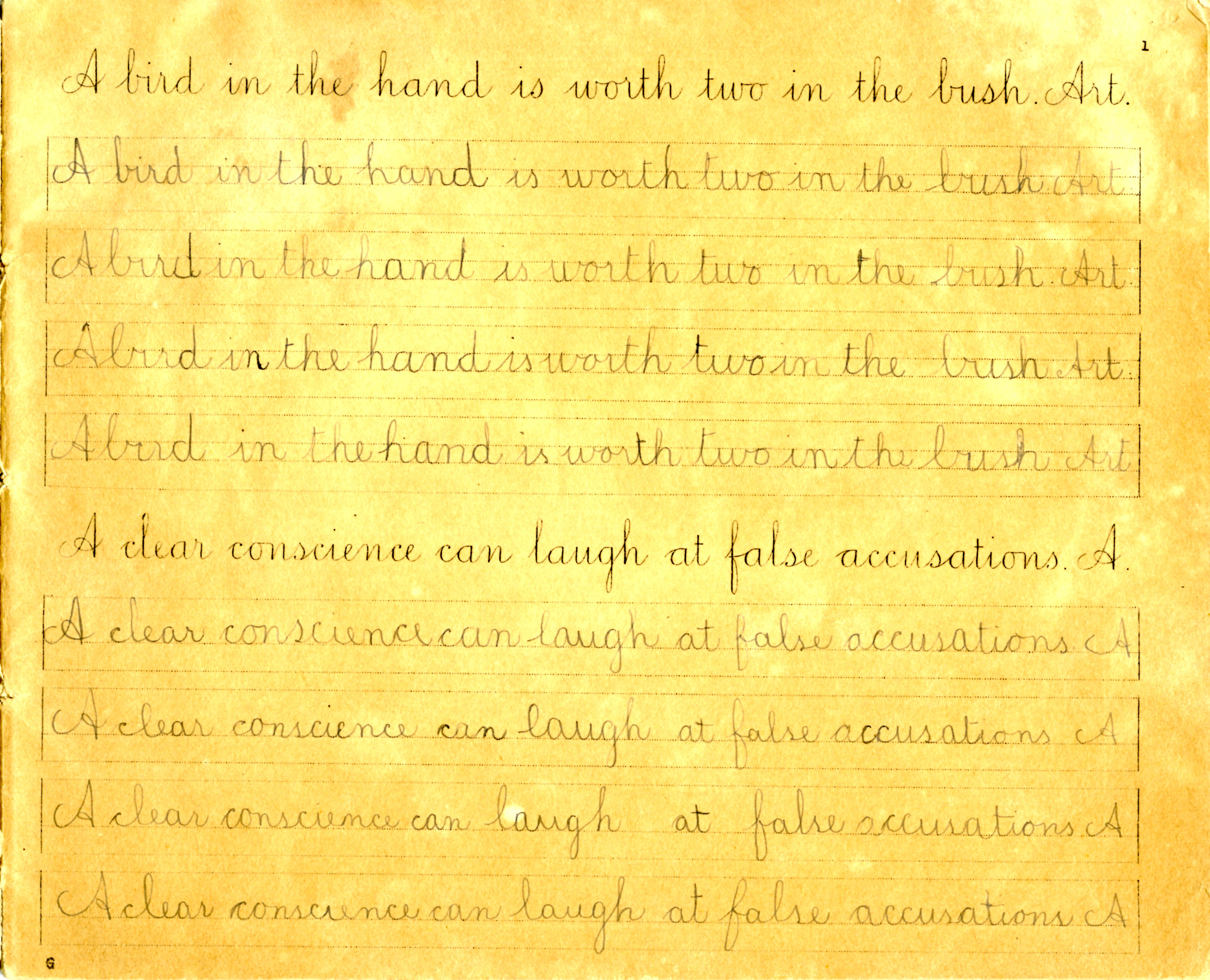 Penmanship scribbler of Catherine M. Fraser that was used to teach children how to cursive write by copying out pre-set sentences in the book.
