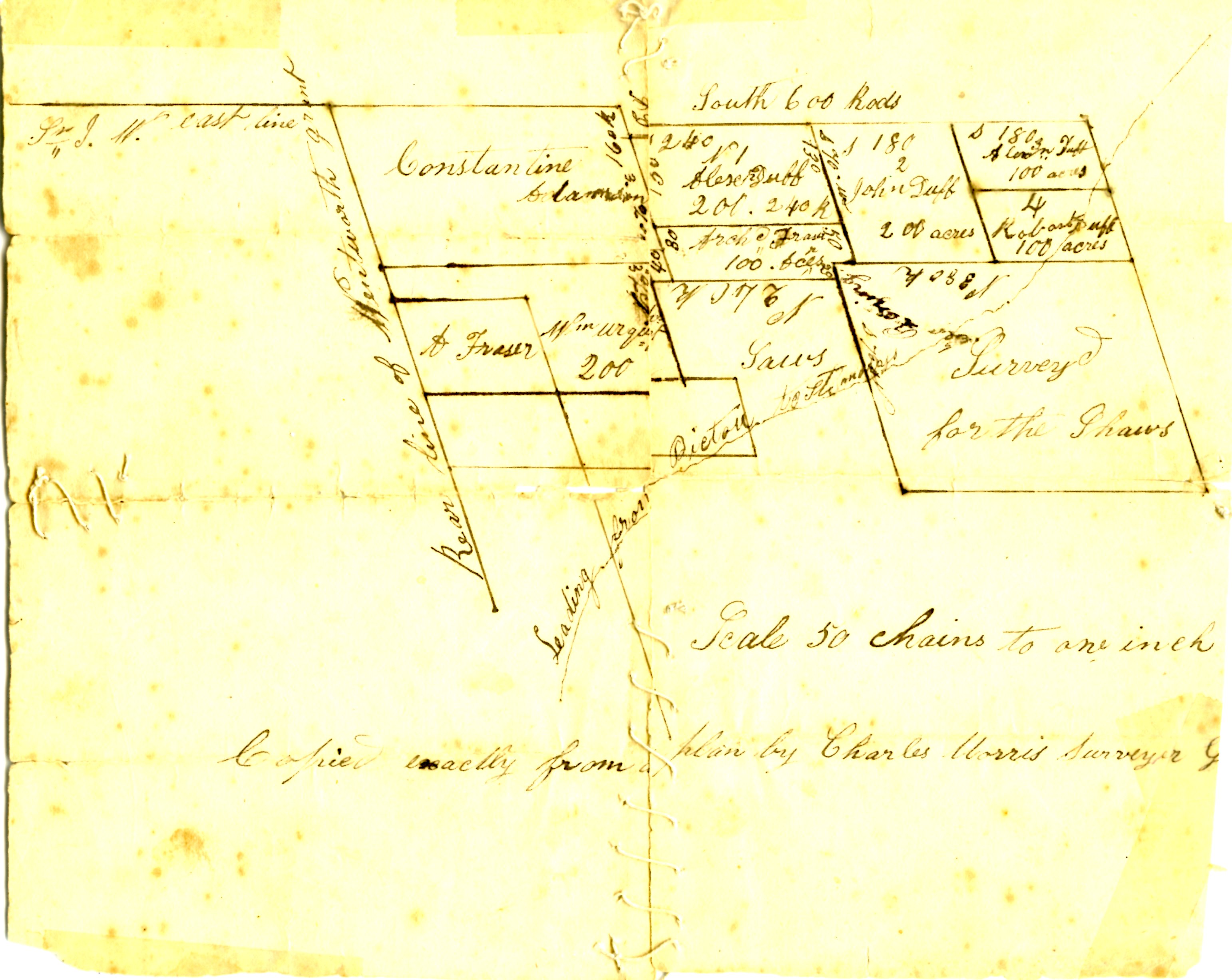 Map detailing James Fraser's land outside of Pictou, surveyed by Charles Morris. Parts of map are stitched together