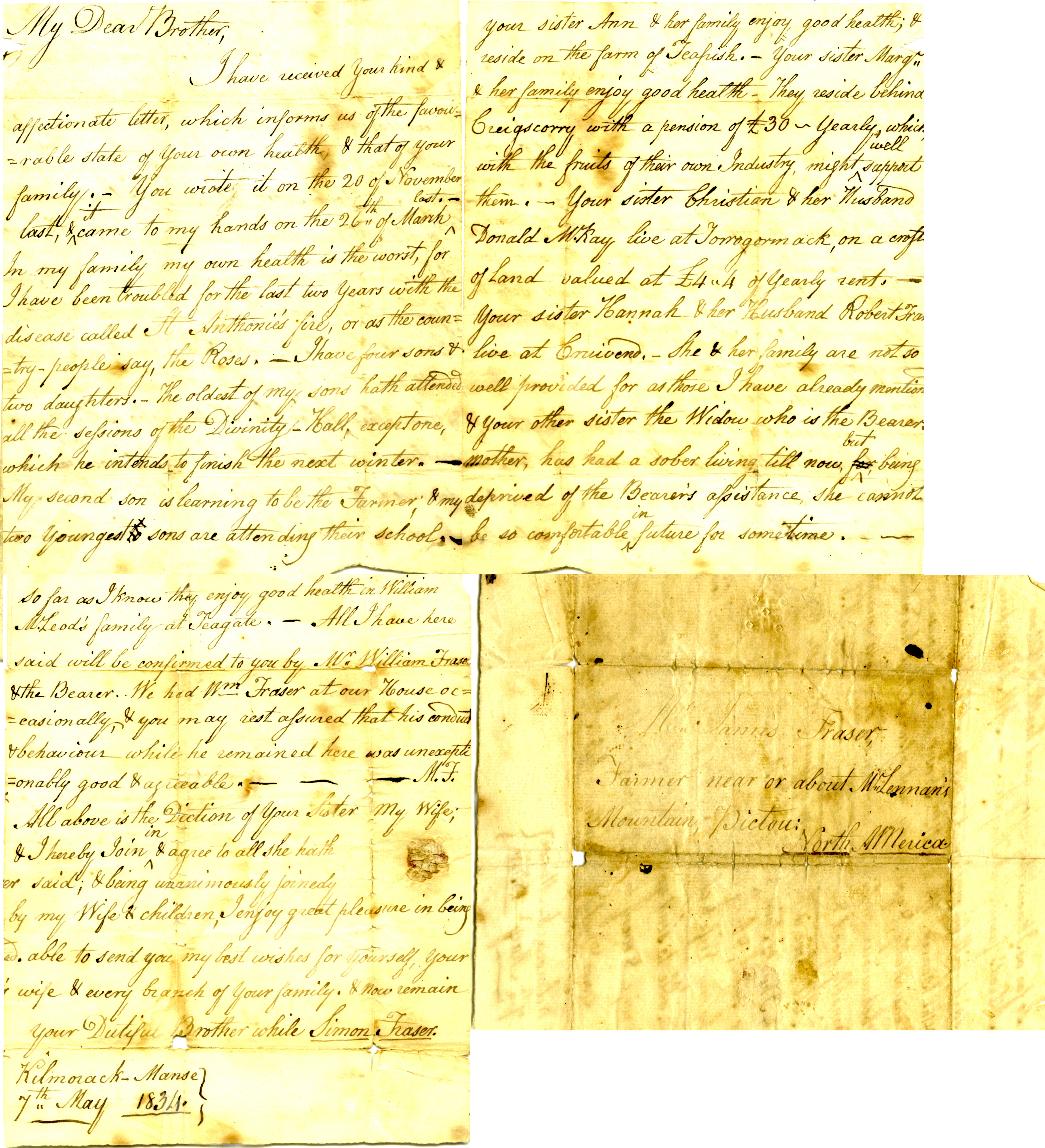 All above is the diction of your sister, my wife; and I hereby join in and agree to all she hath saidl and being unanimously joined by my wife and children, I enjoy great pleasure in being able to send you my best wishes for yourself, your wife, and every branch of your family. And now remain you dutiful brother while Simon Fraser.