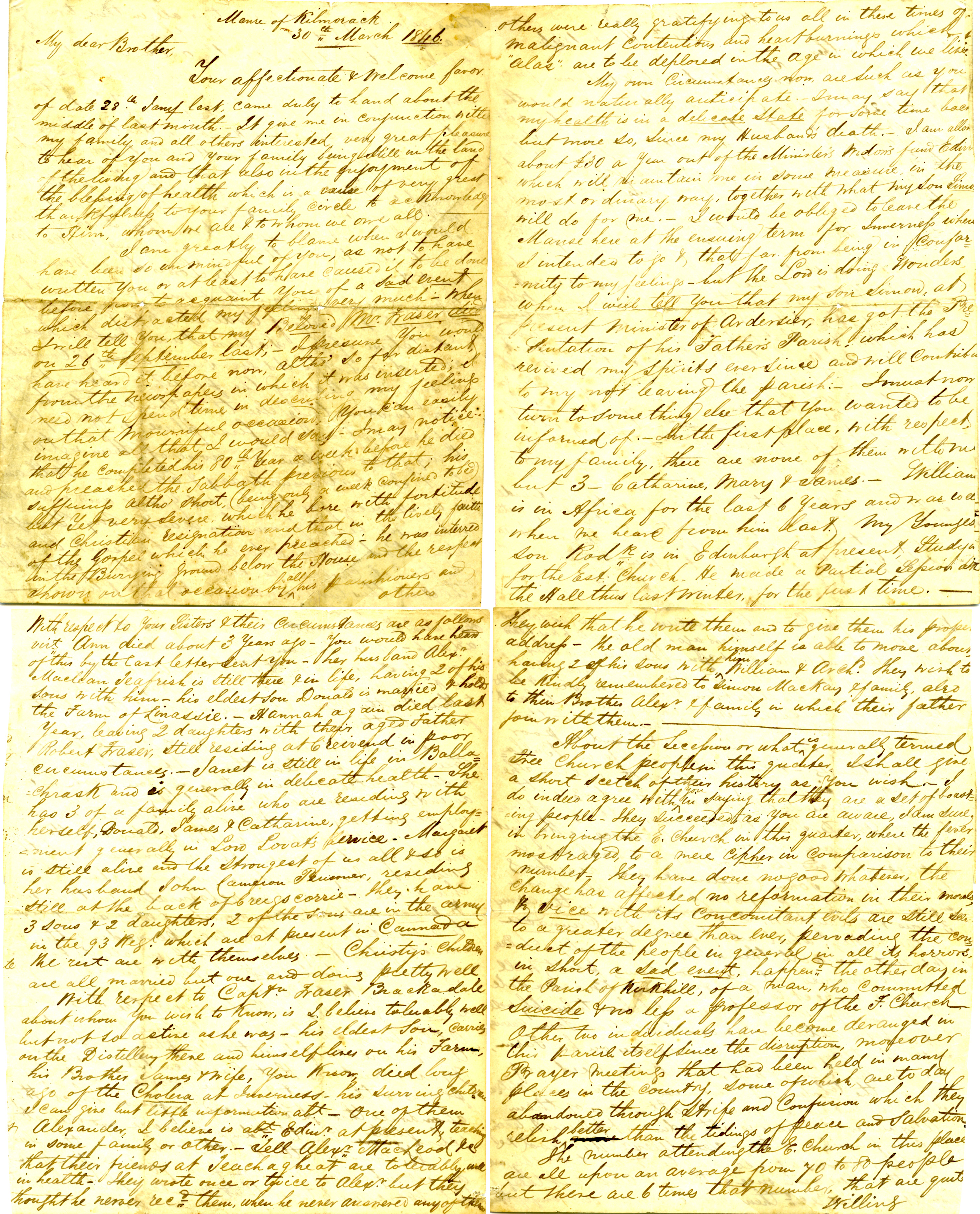 My own circumstances now are such as you would naturally anticipate. I may say that my health is in a delicate state for some time back but more so, since my husband’s death. I am allow about £30 a year out of the minister’s widows fund [Edin?] which will maintain me in some measure in the most ordinary way, together with what my son Simon will do for me. I would be obliged to leave he Manse here at the ensuring term for Inverness which I intended o go and tha far from being in conformity to my feelings – but he Lord is doing wonders when I will tell you that my son Simon, at present Minister of Ardensier, has got he Presentation of his Father’s Parish, which has received my spirits ever since and will contribute to my [not?] leaving the parish. I must now turn to something else that you wanted to be informed of. In the first place, with respect to my family, there are non of them with me but 3 – Catherine, Mary, and James. William is in Africa for the last 6 years and was still when we heard from his last. My youngest son Roderick is in Edinburgh at present, studying for the established Church. He made a partial [sepional the Hallthus?] last winter, for the first time. With respect to your sisters and their circumstances are as follows [wit?] Ann died about 3 years ago – you would have heard of this by he last letter sent you – her husband Alexander MacLean Teaprish is still there and in life, having 2 of his sons with him – his eldest son Donald is married and holds the farm of Limassie. Hannah again died last year, leaving 2 daughters with their aged father Robert Fraser, still residing a Creivend in poor circumstances. Janet is still in life in Ballachrash and is generally in delicate health. She has 3 of a family alive who are residing with herself, Donald, James and Catherine, getting employment generally in Lord Lovat’s service. Margaret is still alive and the strongest of us all and so is her husband John Cameron [Perisoner?], residing still at the back of Creigscorrie. Hey have 3 sons and 2 daughters. 2 of the sons are in he army in the 93 regiment which are at Present in Canada the rest are with themselves. Christy’s children are all married but one and doing pretty well. With respect to Captain Fraser Brackadale about whom you wish to know, is I believe tolerably well on the distillery there and heirs [efflines?] on his farm. His brother James and wife, you know died long ago of the Cholera at Inverness = his serving children I can give but little information about – one of them, Alexander, I believe is about Edinburgh at present, teaching in some family or other. Tell Alexander MacLeod [he?] that their friends at Teachagheat are tolerably well in health. They wrote once or twice to Alexander but they thought he never received them, when he never answered any of them. They wish that he write them and to give them his [present?] address. The old man himself is able to move about having 2 [off his sous?] with him William and Archibald they wish to be kindly remembered to Simon MacKay and family, also o their brothers Alexander and family in which heir father join with them.