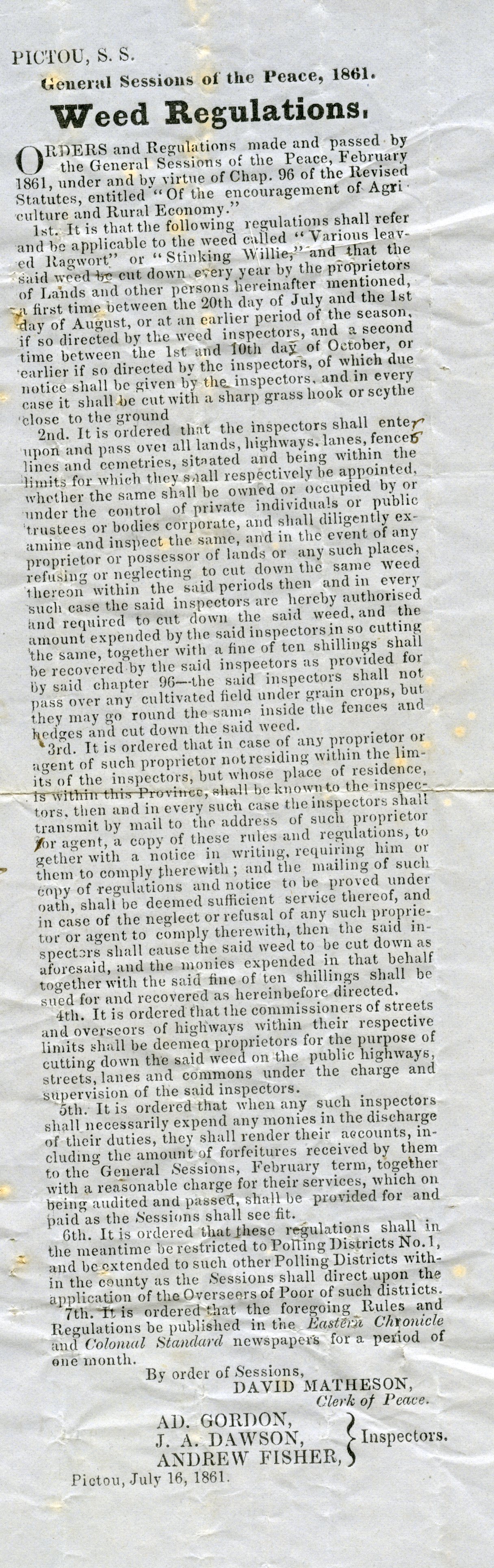Dated 1861, Pictou. Article instructing residents to cut down any plant varients of ragwort. To be published in the papers for a month (papers being the Eastern Chronicle and the Colonial Standard).