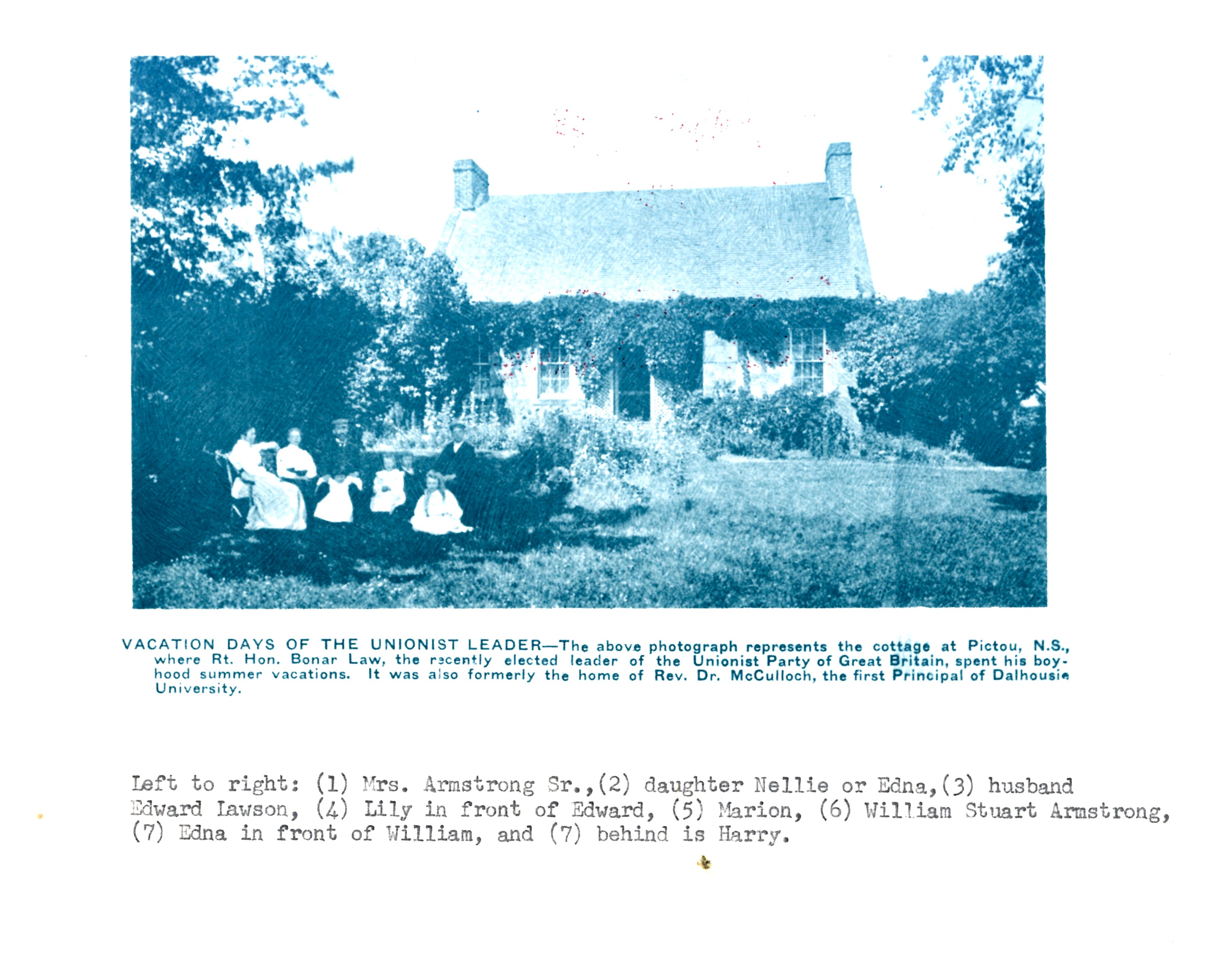 Vacation days of the unionist leader - the above photograph represents the cottage at Pictou, NS, where Rt. Hon. Bonar Law, the recently elected leader of the Unionist Party of Great Britain, spent his boyhood summer vacations. It was also formerly the home of Rev. Dr. McCulloch, the first principal of Dalhousie University.