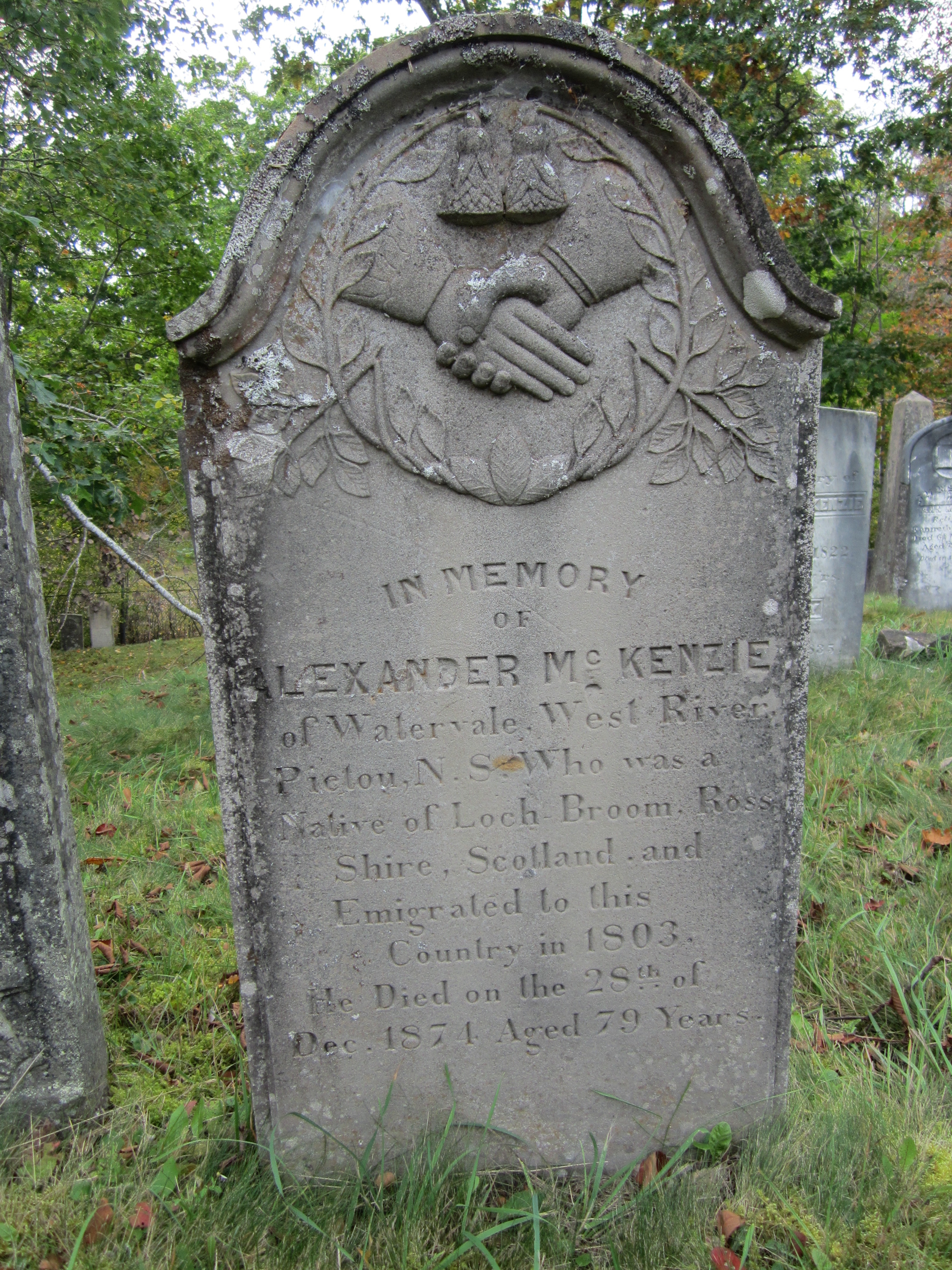IN MEMORY OF ALEXANDER McKENZIE OF WATERVALE WEST RIVER PICTOU N.S. WHO WAS A NATIVE OF LOCH BROOM ROSS SHIRE ,SCOTLAND. AND EMIGRATED TO THIS COUNTRY IN 1803, HE DIED 18TH OF DEC 1874 AGED 79 YEARS.