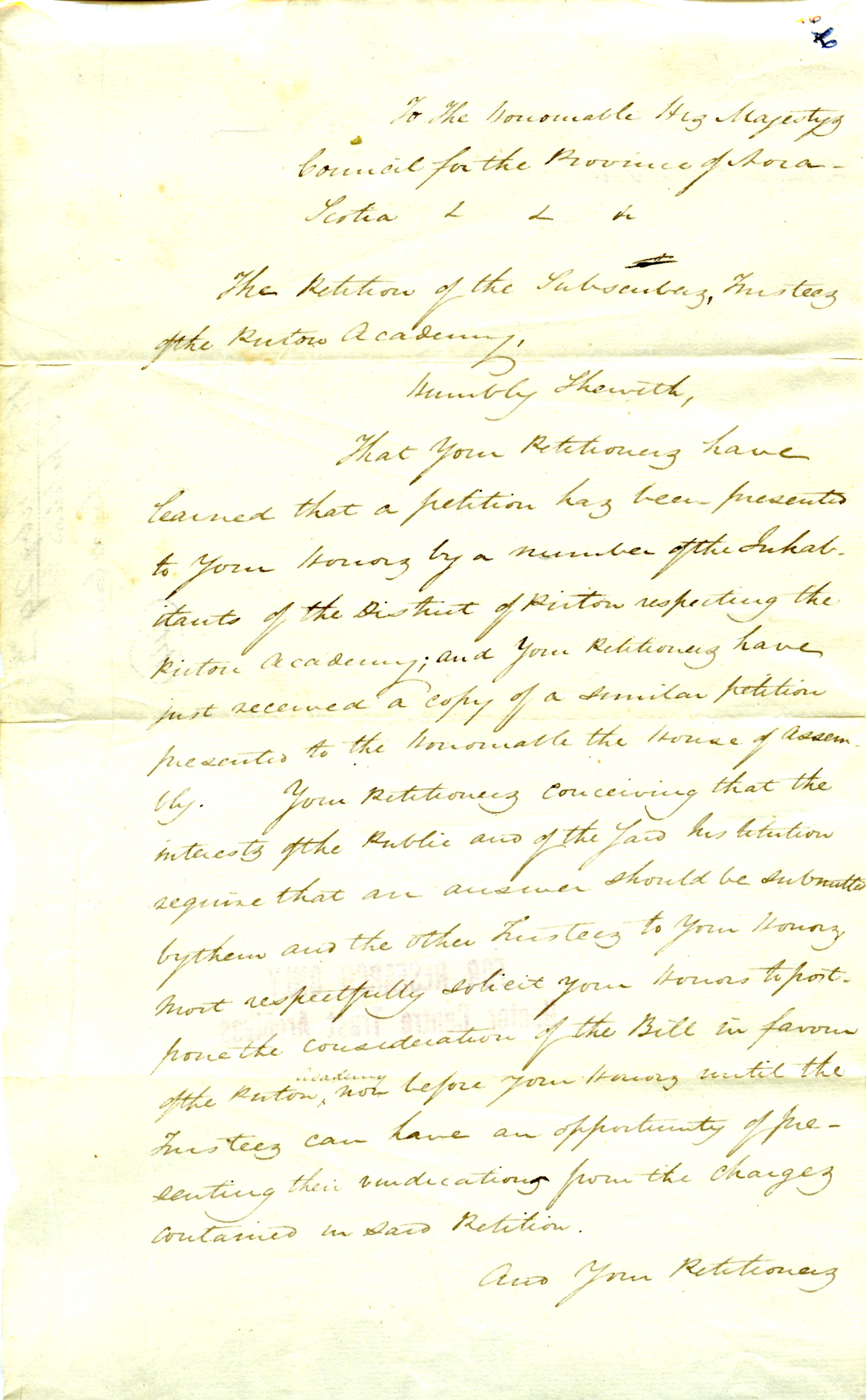 That Your Petitioners have learned that a petition has been presented to your honors by a number of the Inhabitants of the district of Pictou respecting the Pictou Academy; and your Petitioners have just received a copy of similar petition presented to the honorable the house of assembly. Your Petitioning conceiving that the interests of the public and of the lord his petition require that an answer should be submitted by them and the other trustees to your honors most respectably inherit your honors to postpone the consideration of the bill in favour of the Pictou Academy now before you honor until the trustees can have the opportunity of presenting their indications from the changes contained in said petition.