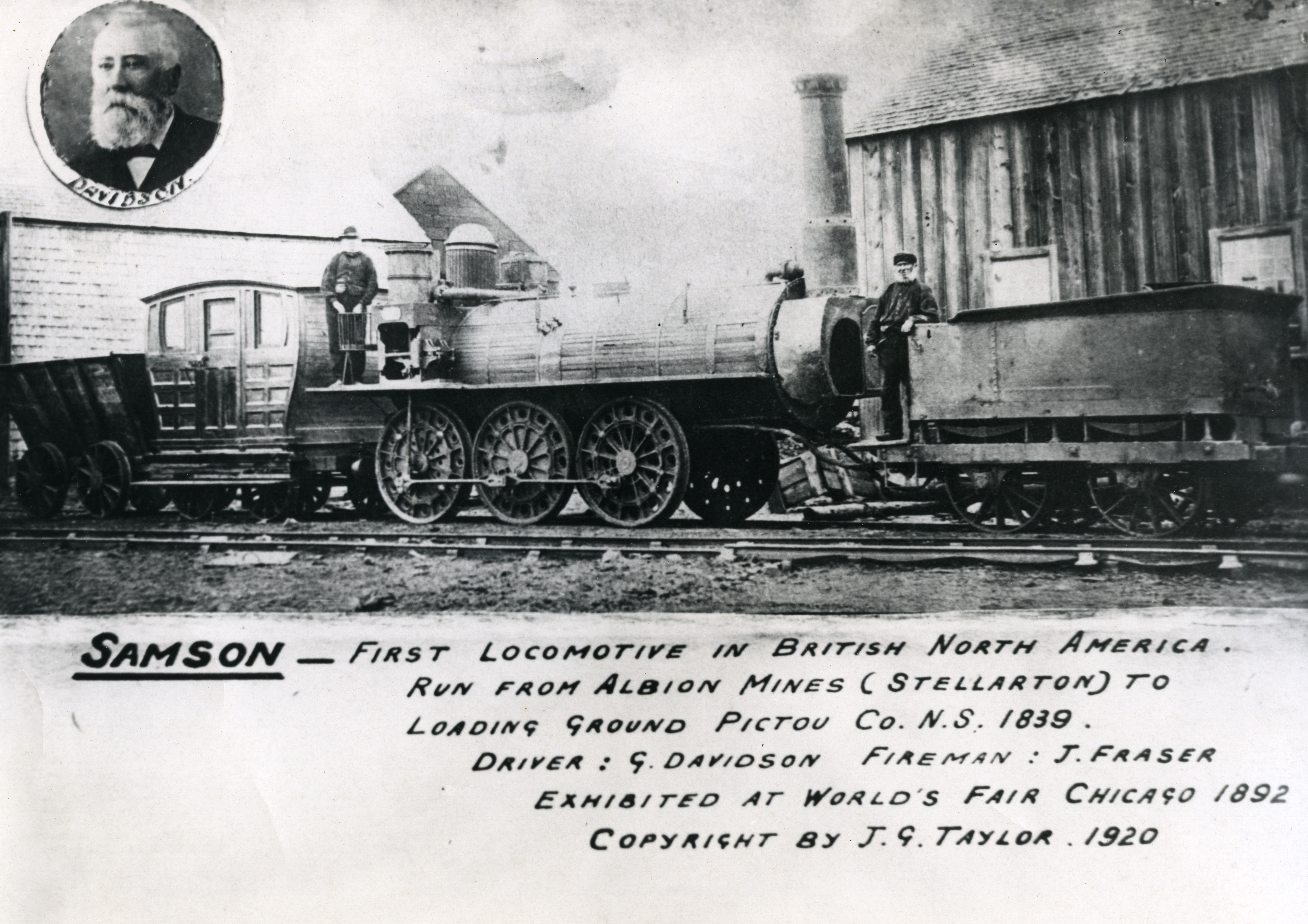 Photo of the Samson Train. Written on the photo: SAMSON- First Locomotive in the British North America. Run from Albion Mines (Stellarton) to loading ground Pictou Co. N.S. 1839. Driver: G. Davidson Fireman: J. Fraser Exhibited at World's Fair Chicago 1892 Copyright by J.G. Taylor 1920 Photo Inset: Davidson