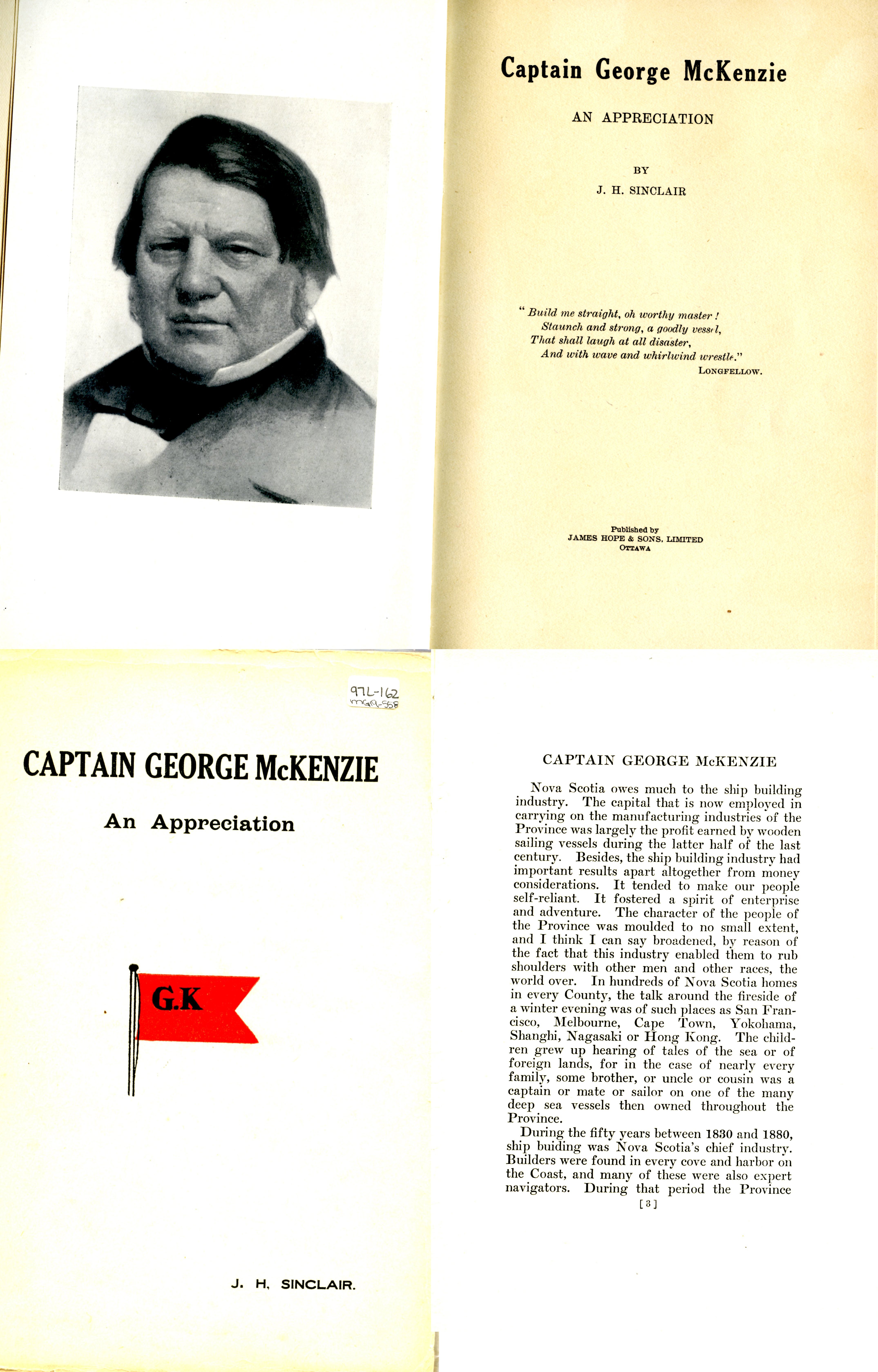 Small book detailing the life of Capt. George McKenzie, a sailor and ship builder of New Glasgow. Book written by J.H. Sinclair an published in Ottawa.