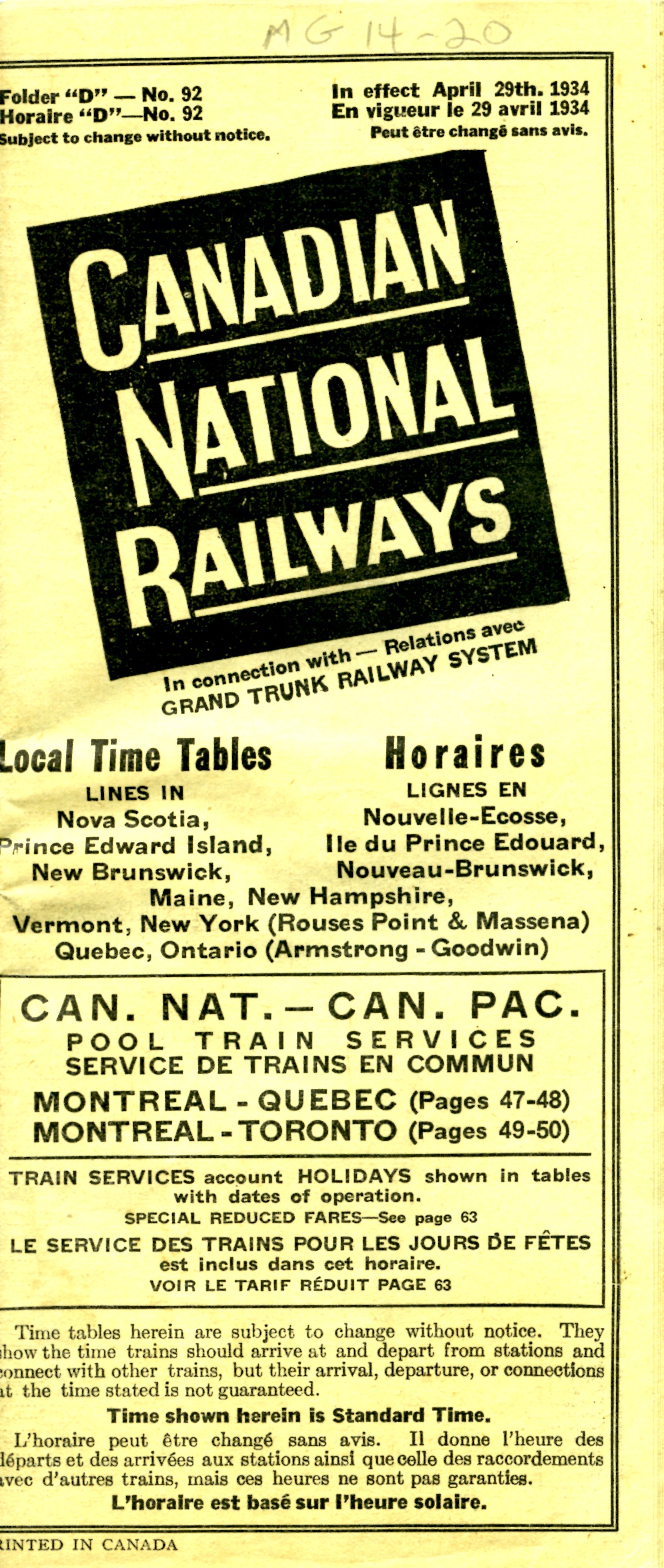 Cover of maps and schedule lists for the Canadian National Railways (CN rail), with connections in the Maritimes