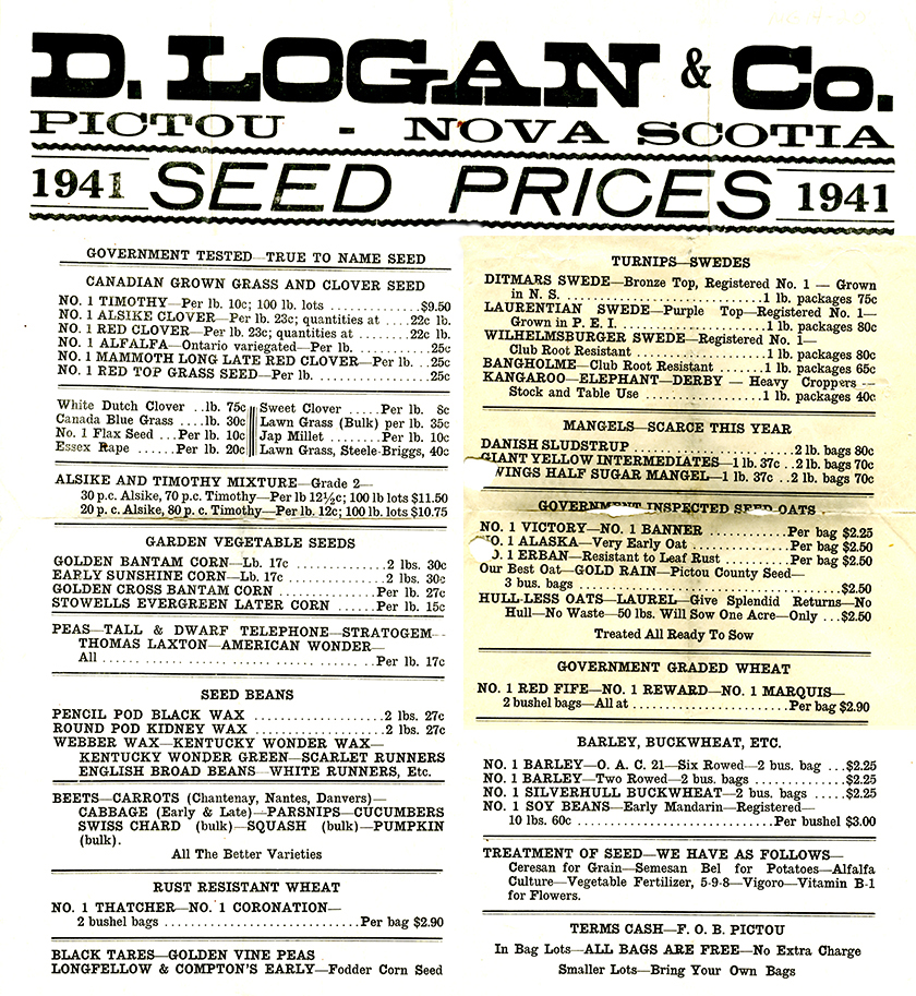 List of seed prices for D. Logan & Co., Pictou, in 1941