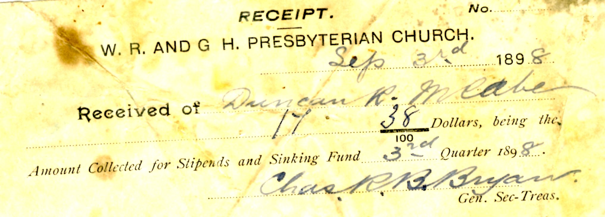 Receipt issued by churches in 1898 on Sept. 3rd for Duncan R. McCabe, signed by Charles R. B. Bryan