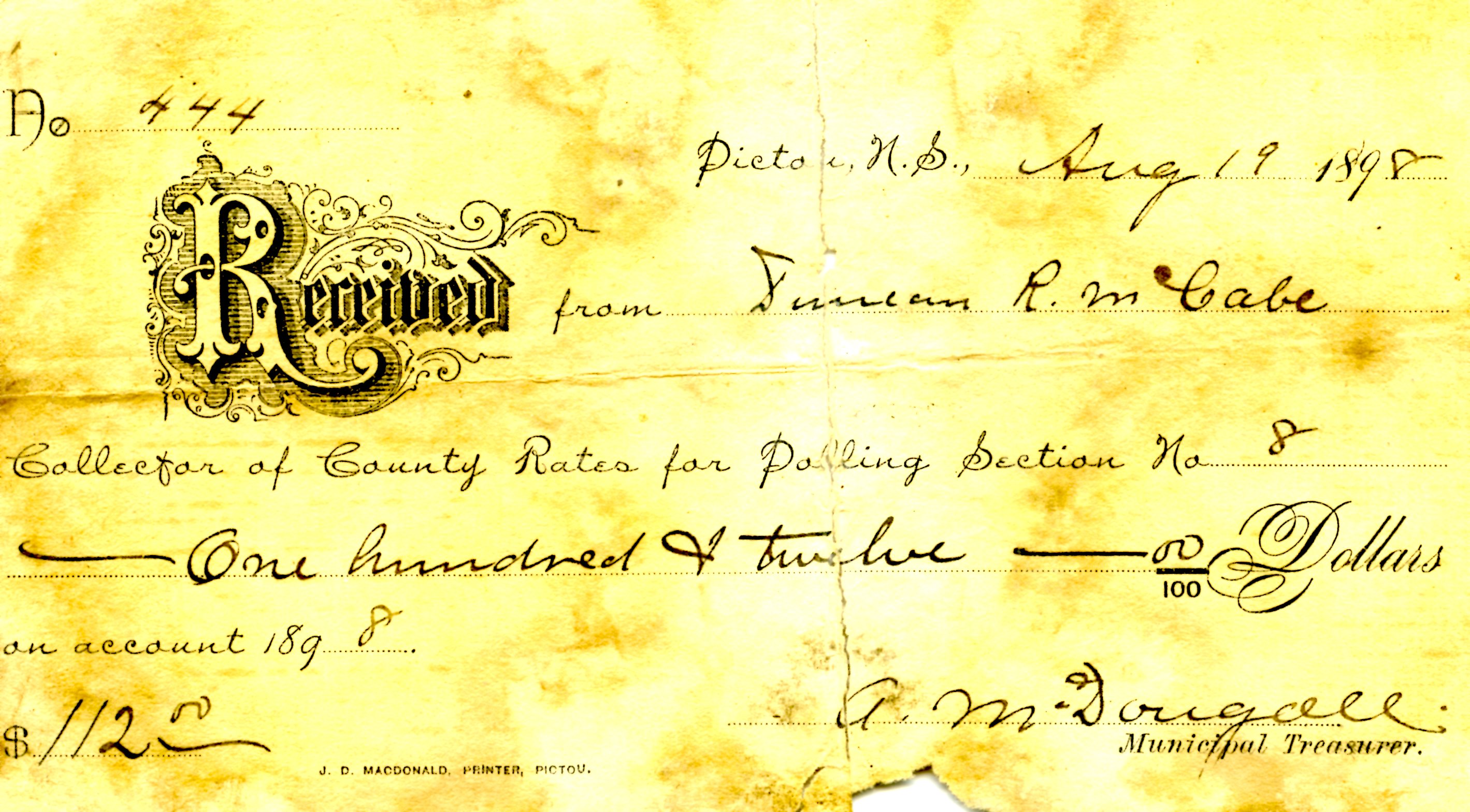 Issued by A. McDougall on Aug. 19th, 1898 for the collection of County rates