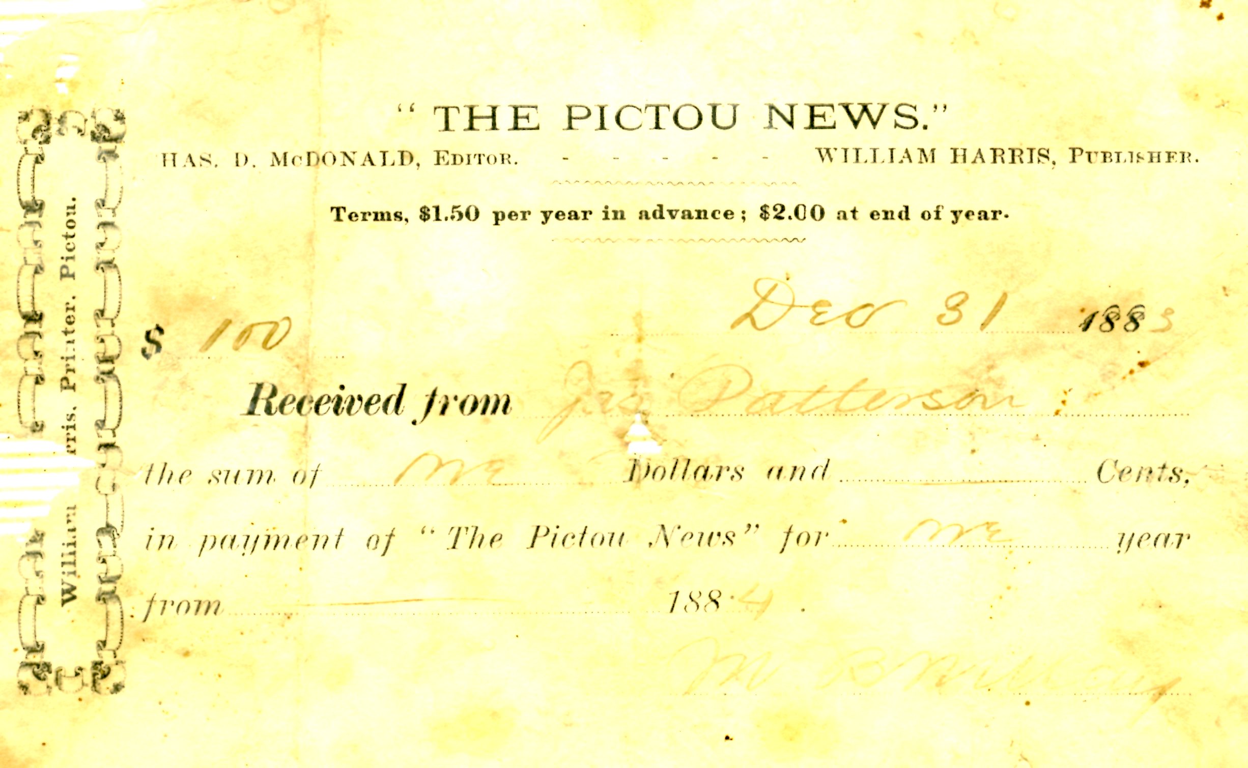 | Tags: | Pictou News, newspaper, receipt, William Harris, James Patterson, Patterson |