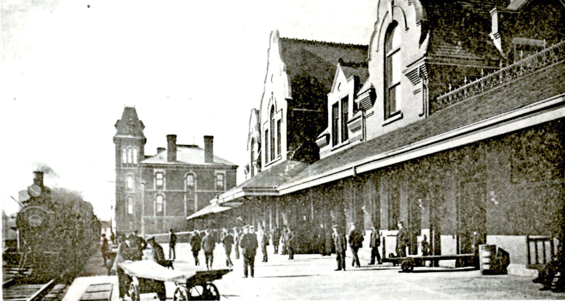 Photo of the railway station on the right and Custom House in the back, part of the Pictou, Nova Scotia travel book of 1916.
