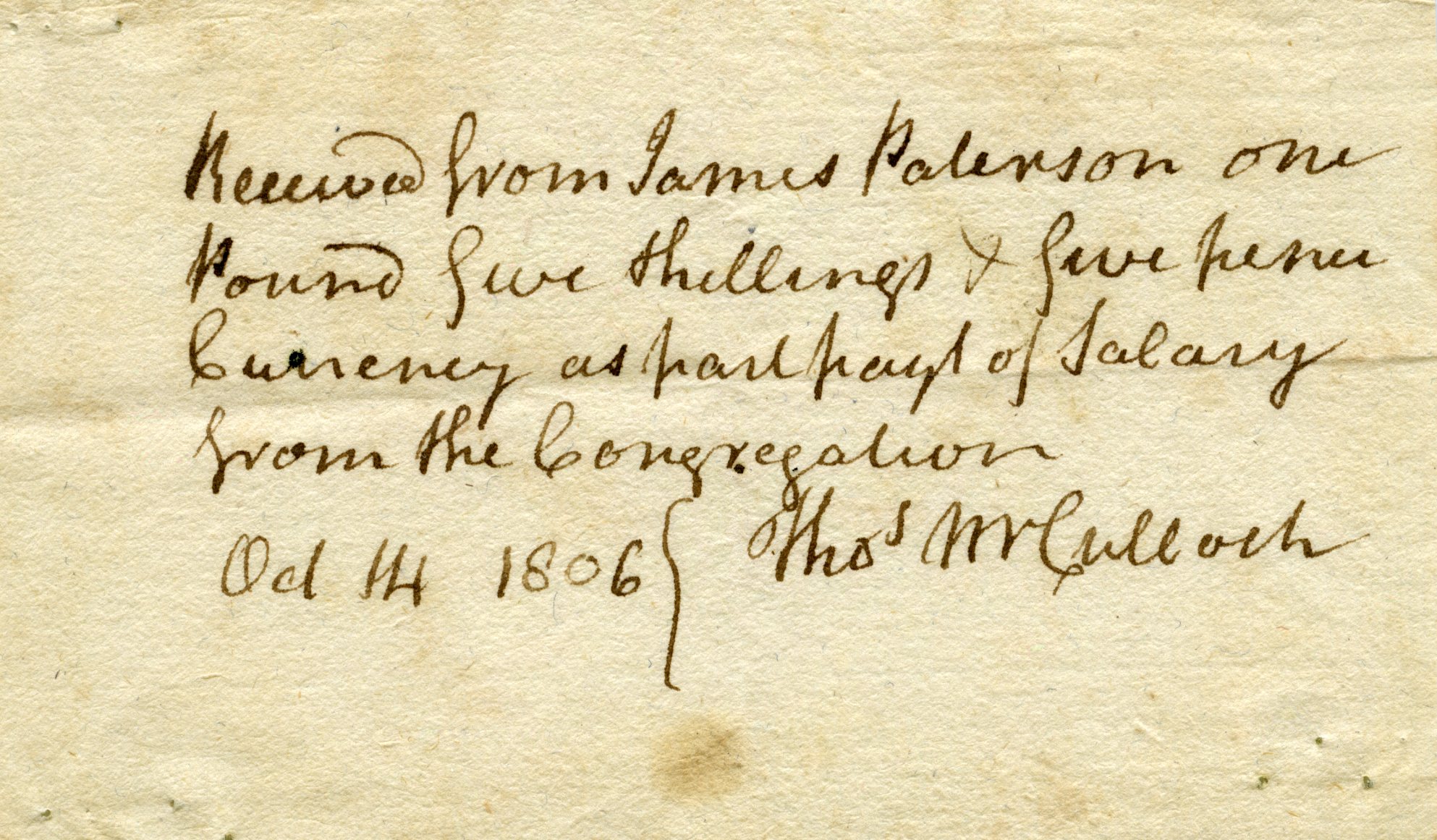 "Recieved from James Patterson one pound five shellings and five pence currency as [part pagt?] of Salary from the Congregation.