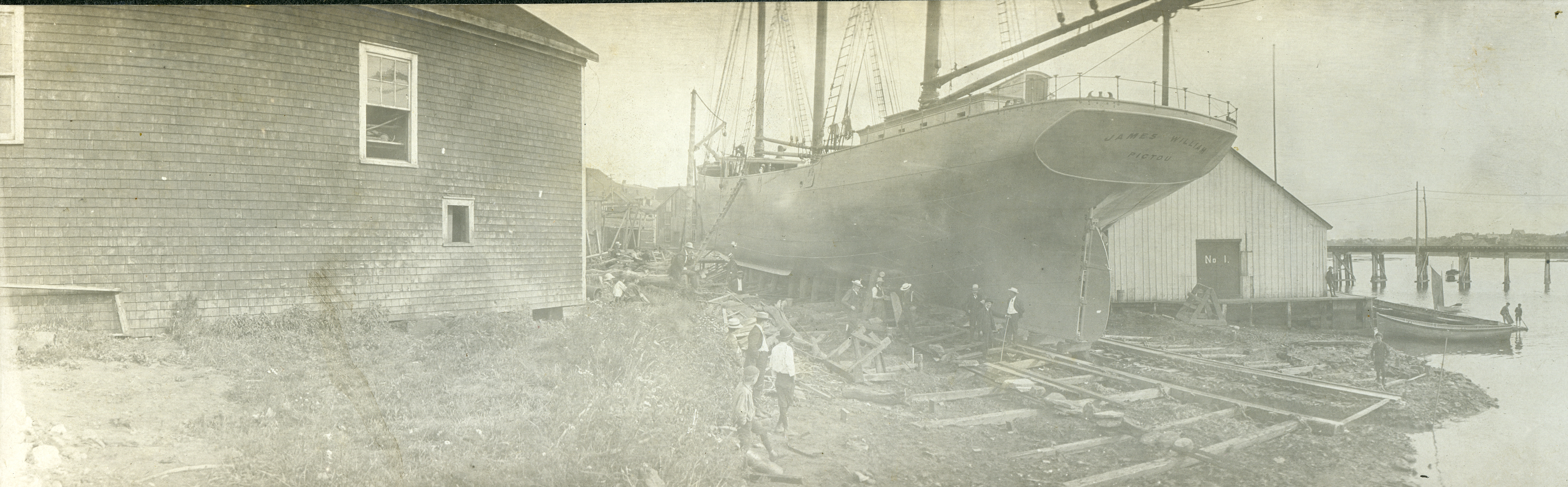 Photo of a ship in a slipway. written on the front of the ship is: James William Pictou