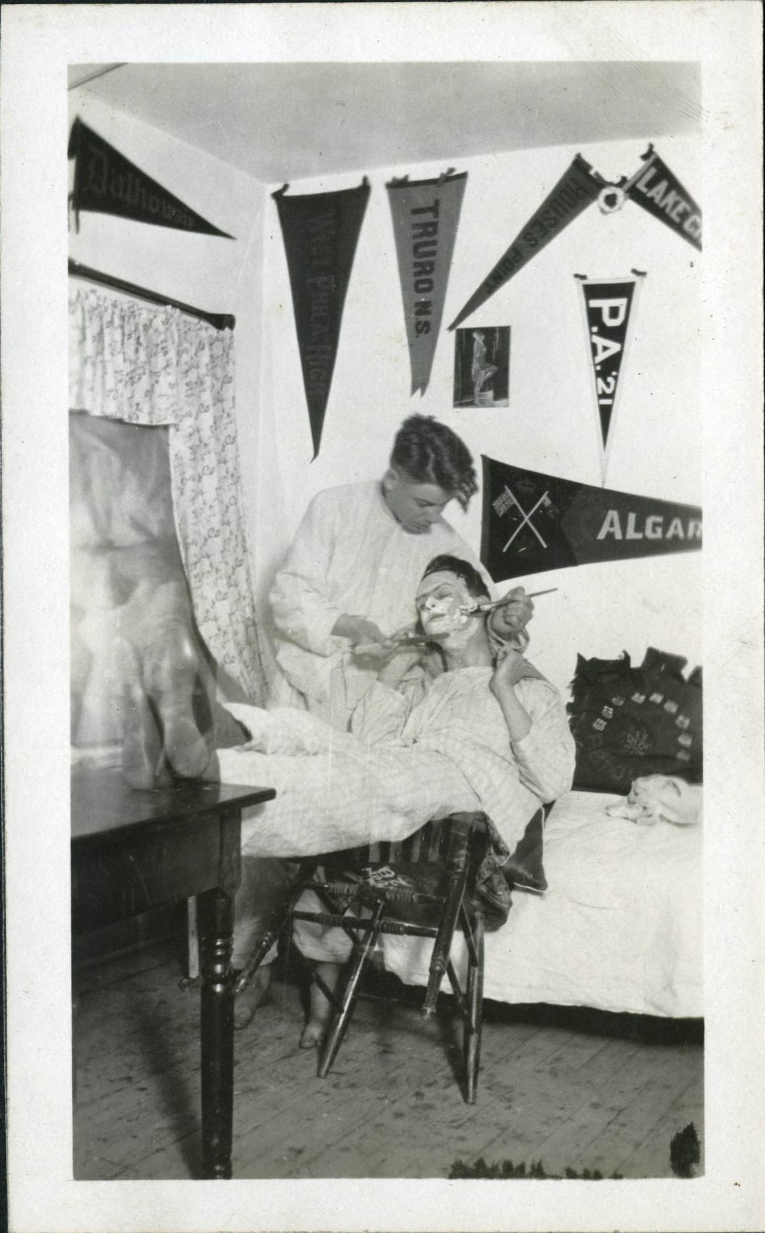 Photo taken in May 1922, "A close shave, Tom McLean, Doug MacDonald"