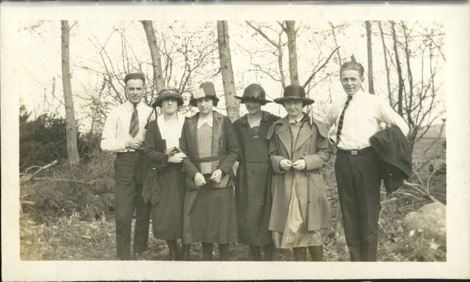 Photo taken in May 1922, "Sunday Scenery: Bert, Chubby, Bot, Hilda, Lena, Bingo"