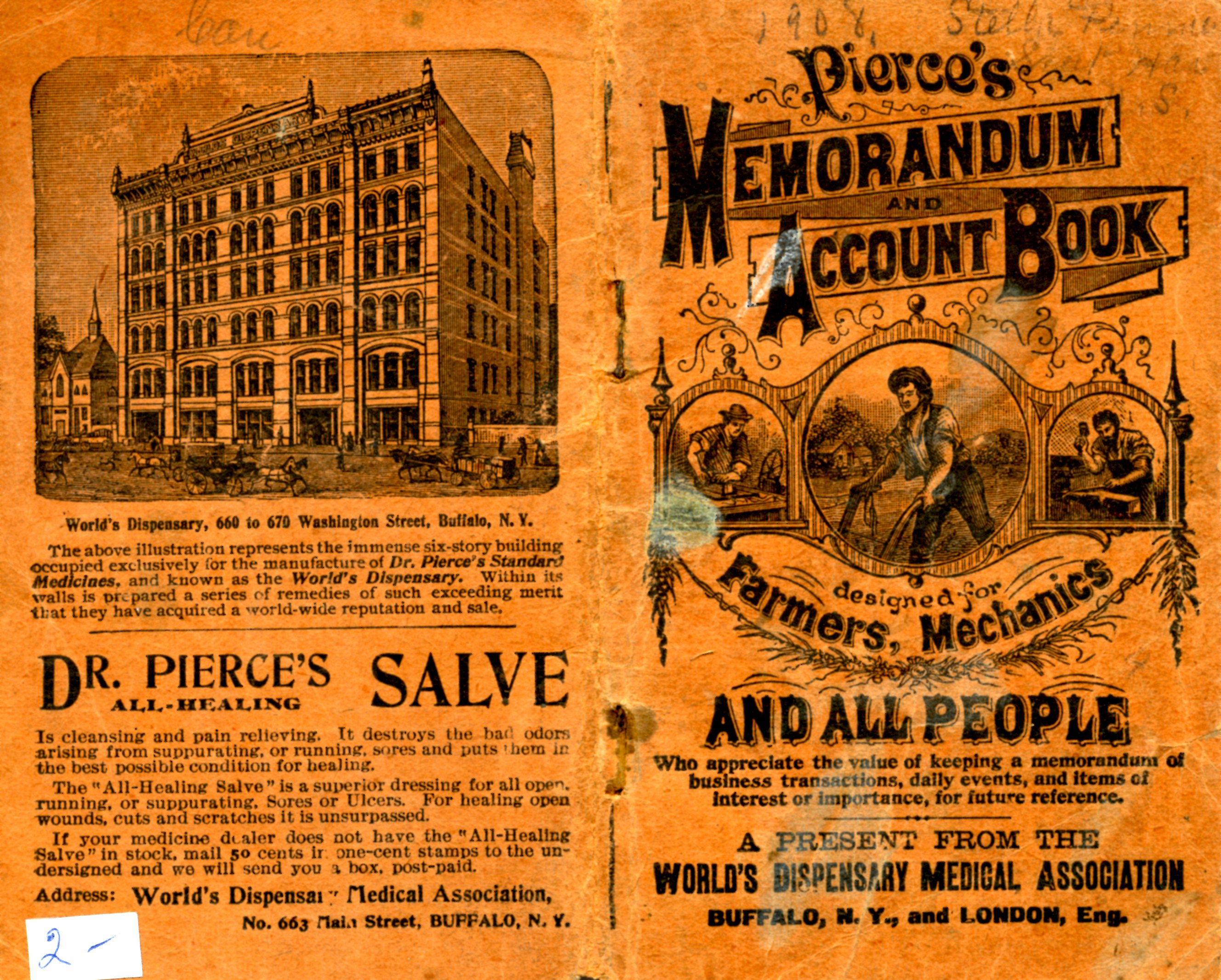 Memorandum book and calendar for 1908, with little poems and stories throughout. Distributed by the World's Dispensary Medical Association.