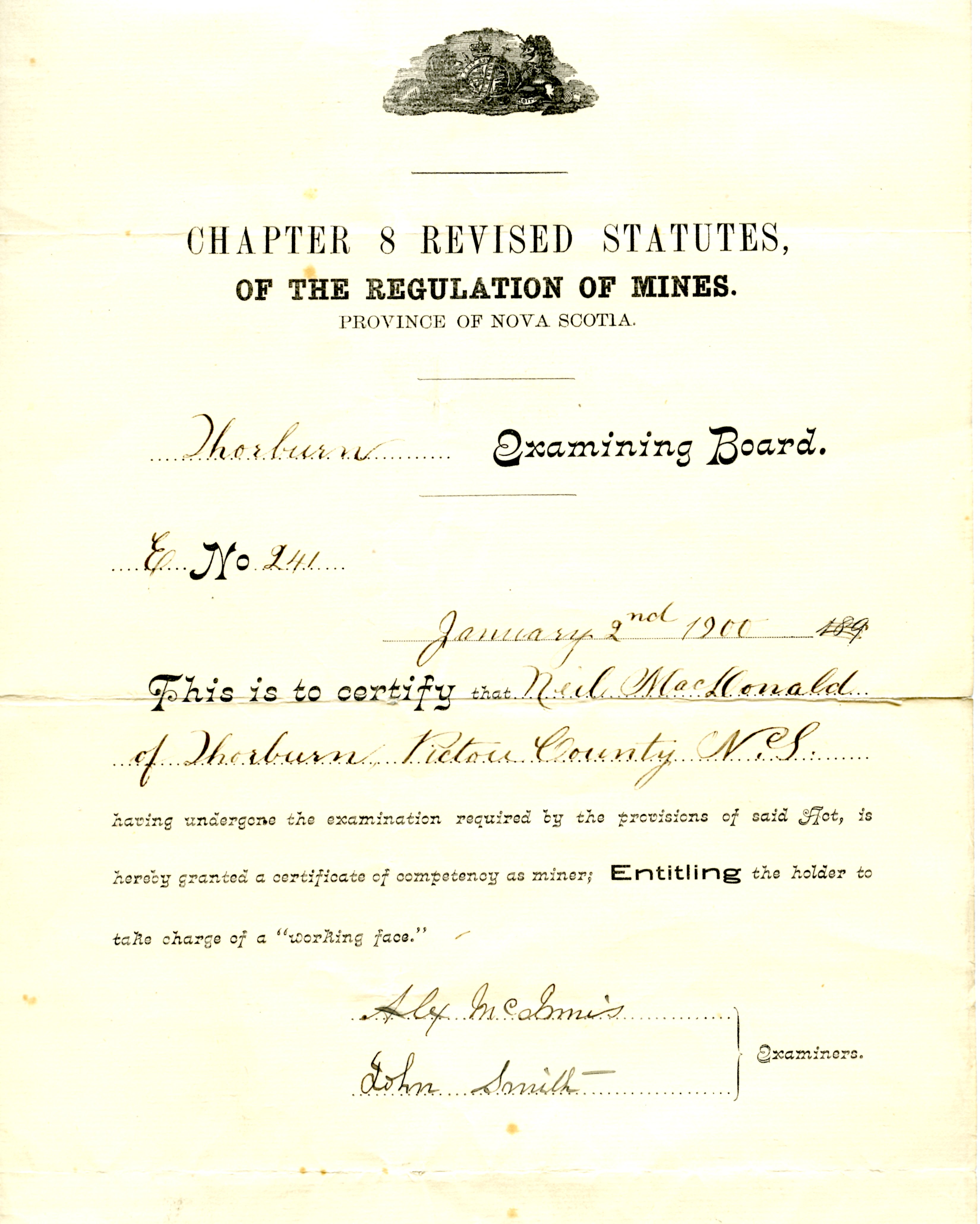 This is to certify that Neil MacDonald of Thorburn, Pictou County, N.S. having undergone the examination required by the provisions of said Act, is hereby granted a certificate of competency as miner; entitling the holder to take charge of a "working face."