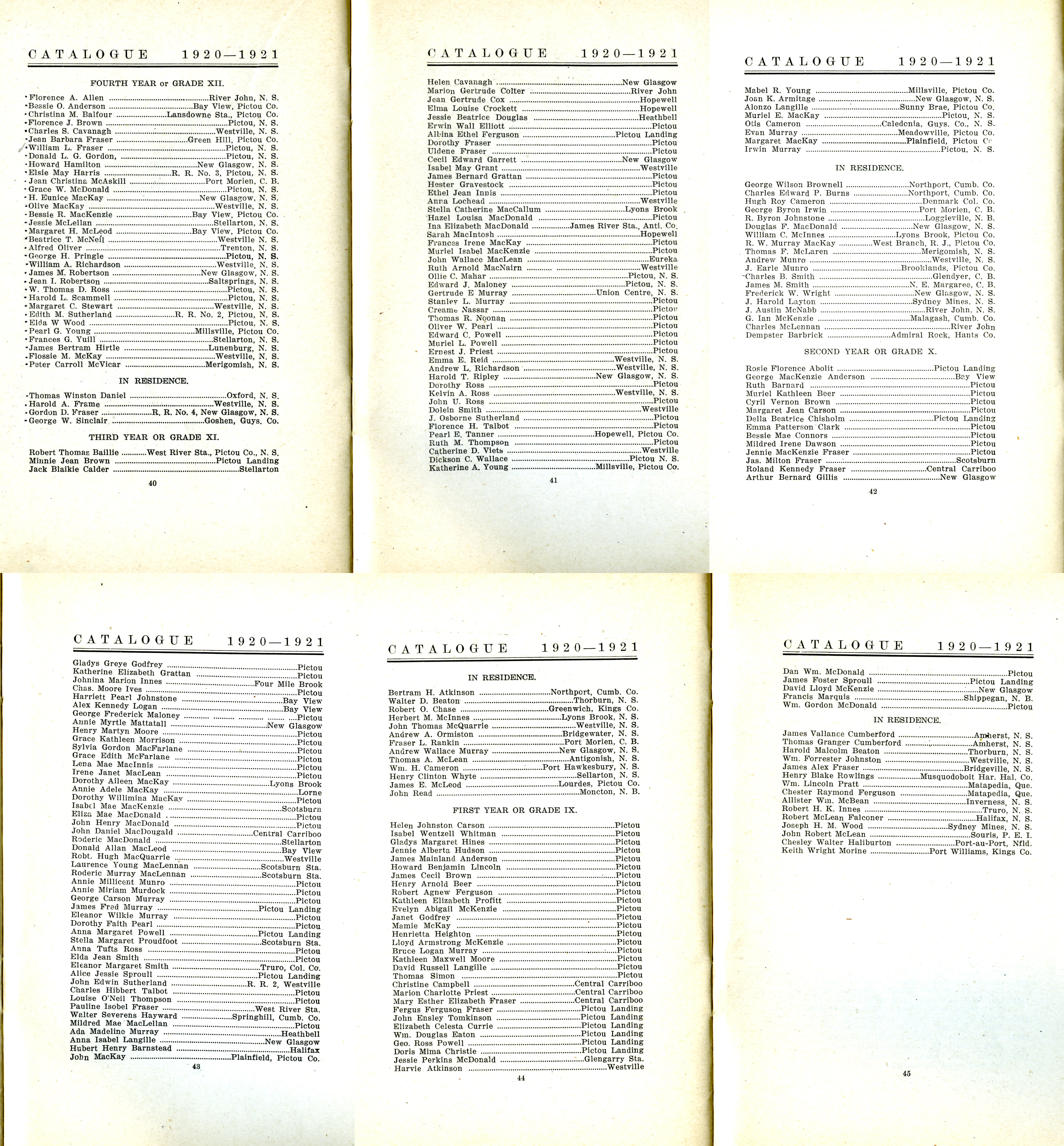 1920-1921 Pictou Academy Class Catalogue