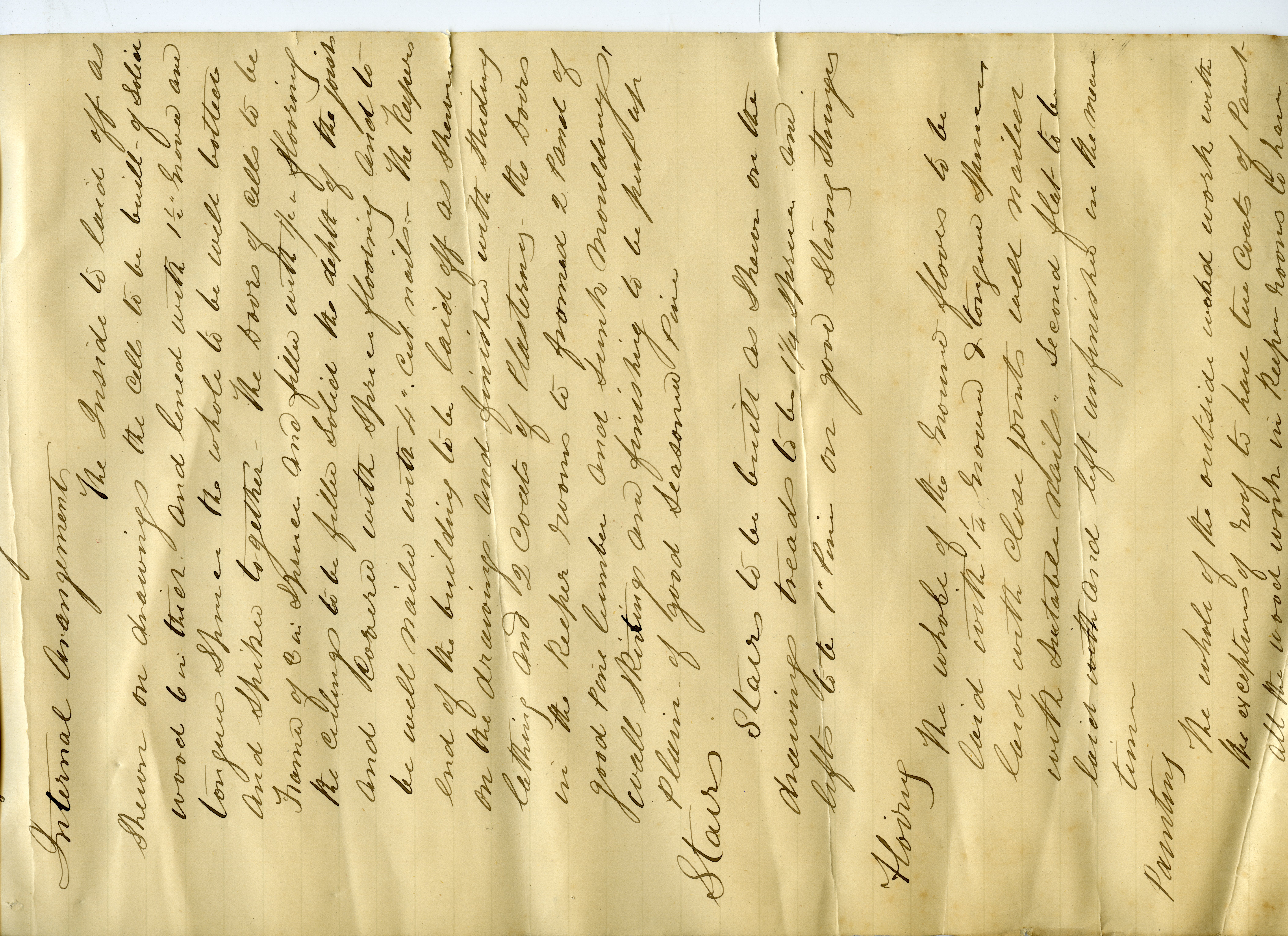 The inside to laid off as shown on drawings the cells to be built of solid wood 6 inch their and lined with 1 1/2 grove and tongue spruce. The whole to be well lotter And spiked together. The doors of cells to be formed of 3 inch spruce and filled with 1 ½ a flooring the ceilings to be filled solid. The depth of the joist and covered with spruce flooring and to be well nailed with 4 inch cut nails. The keepers’ end of the building to be laid off as shown on the drawings and finished with studding lathing and 2 coats of plastering . The doors in the keeper rooms to formed 2 panel of good pine lumber and sink mouldings, wall skirting and finishing to be put up plain of good seasoned pine.