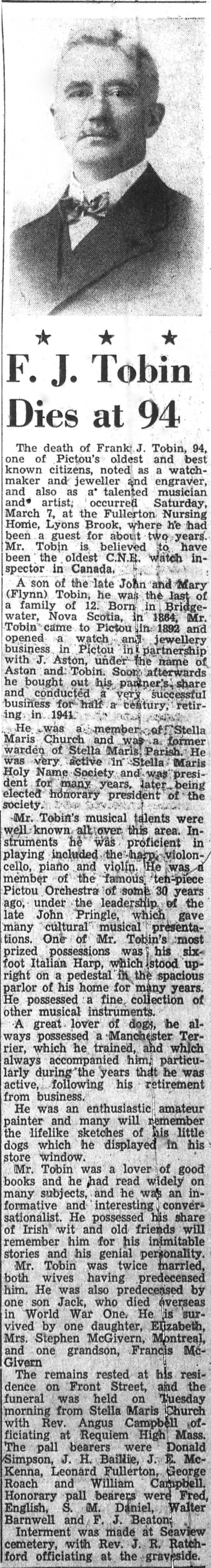 | Tags: | Frank J Tobin, jeweller, Pictou, watchmaker, engraver, musician, artist, Bridgewater, harp, Pictou Orchestra, Irish, Flynn, 1959 |