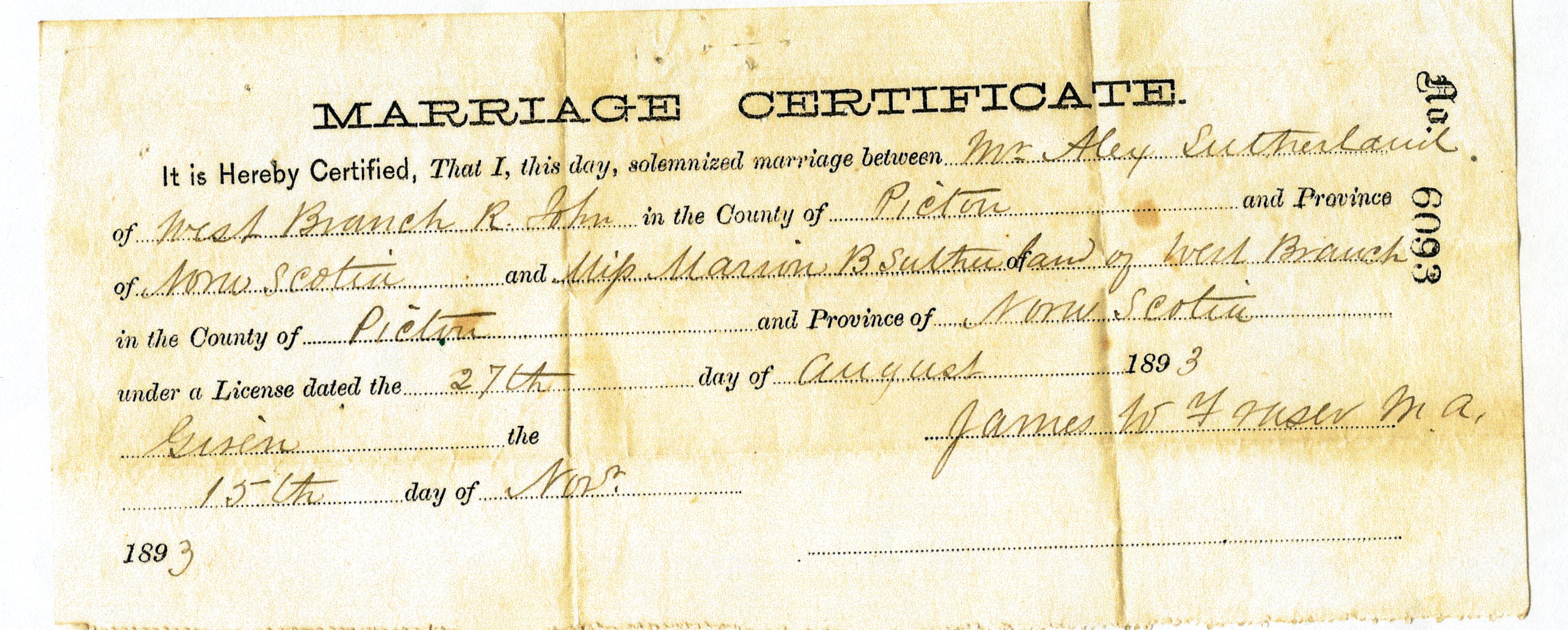 Marriage Certificate Between Alexander & Marion (Bell)Sutherland of West Branch , River John dated August 27 1893