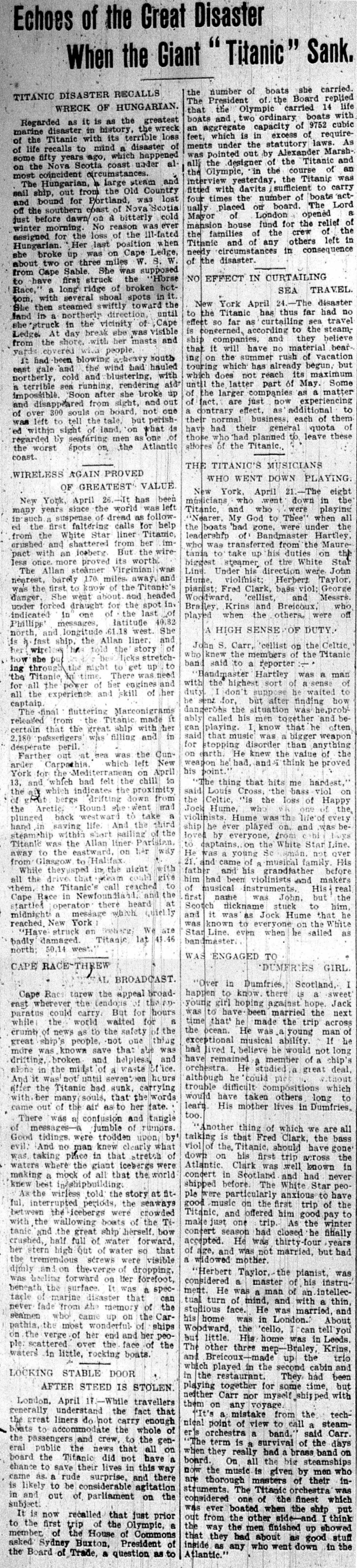 | Tags: | Titanic, Pictou Advocate, 1912, Hungarian, Carpathia, Olympic, Mauretania, Virginian, Portland, Nova Scotia, Cape Lodge, Cape Sable, John Hume, Herbert Taylor, Fred Clark, George Woodward, Bradley, Krins, Breicoux, John S Carr, Louis Cross, Hartley, orchestra, marconigrams, Marconi |