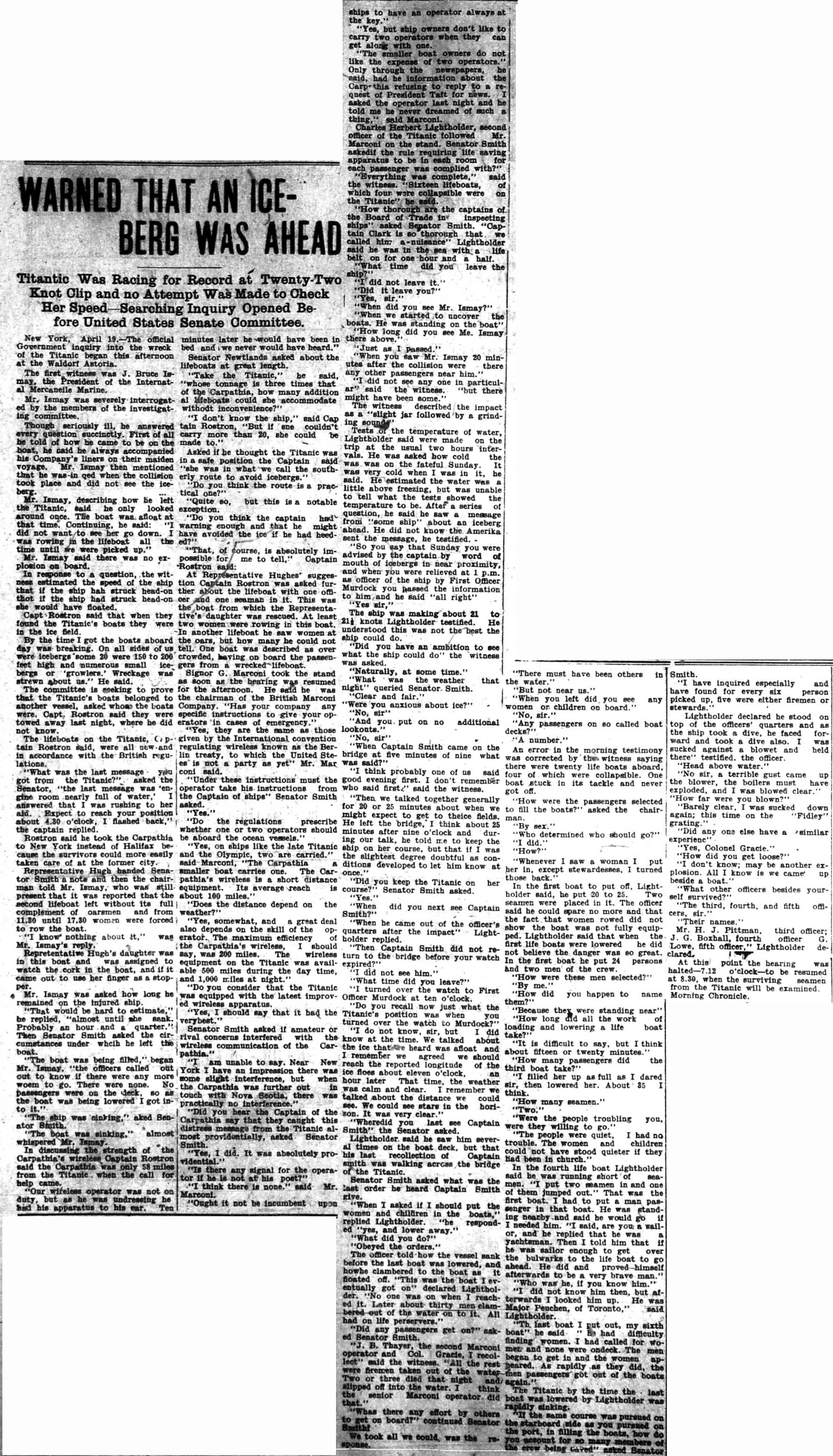 | Tags: | J Bruce Ismay, Captain Rostorn, Waldorf Astoria, Hugh, Smith, Marconi, Lightholder, Amerika, Murdock, J B Thayer, Colonel Gracie, H J Pittman, J G Boxhall, G Lowe, icebergs, growlers, wireless |