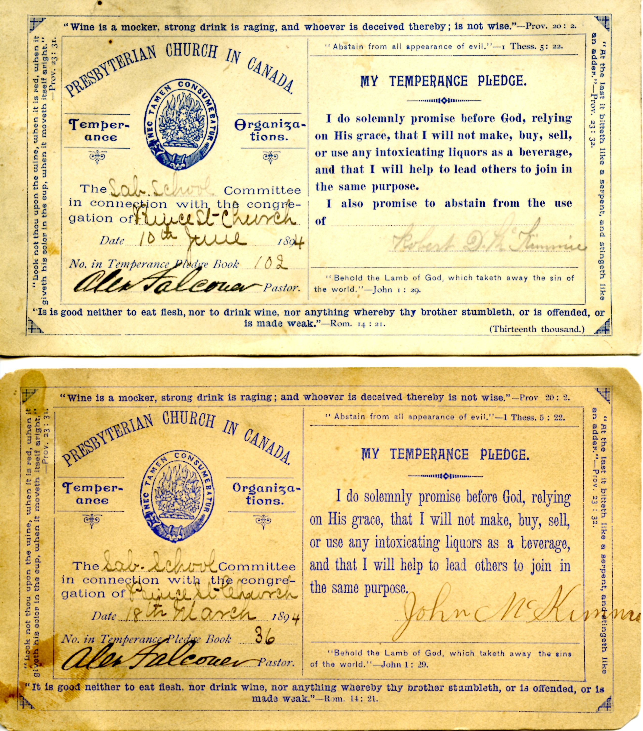 Temperance Cards signed by Robert D McKimmie dated 10 June 1894 and John McKimmie dated 18 March 1894 of the Prince Street Church. Also signed by Alex Falconer, Pastor.