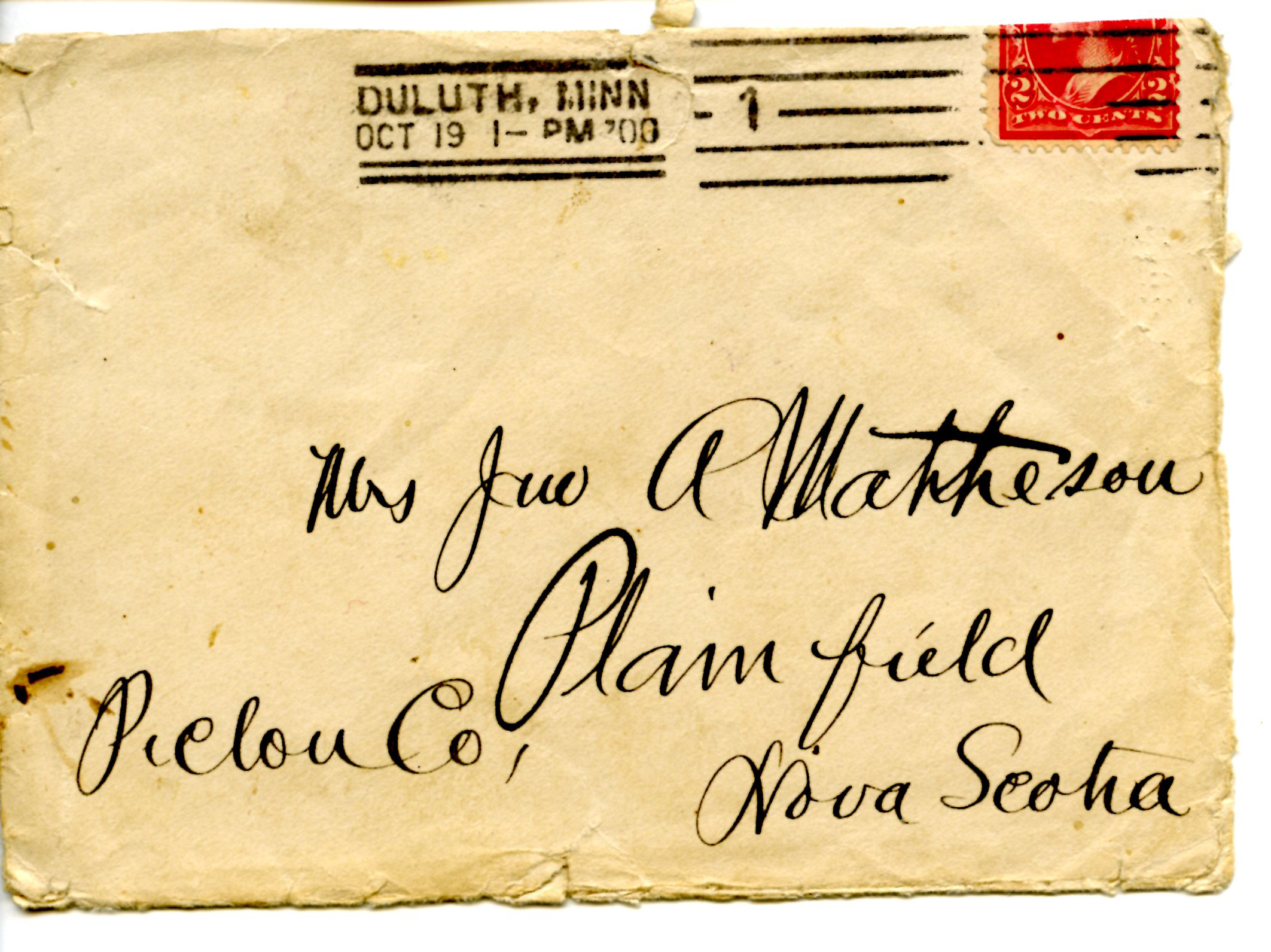 Envelope mailed from Duluth, Minnesota on Oct 19, 1900 to Mrs Jon A Matheson, Plainfield, Pictou Co, Nova Scotia. Postmark on back, Scotsburn Station, Oct (22 or 24?), 1900