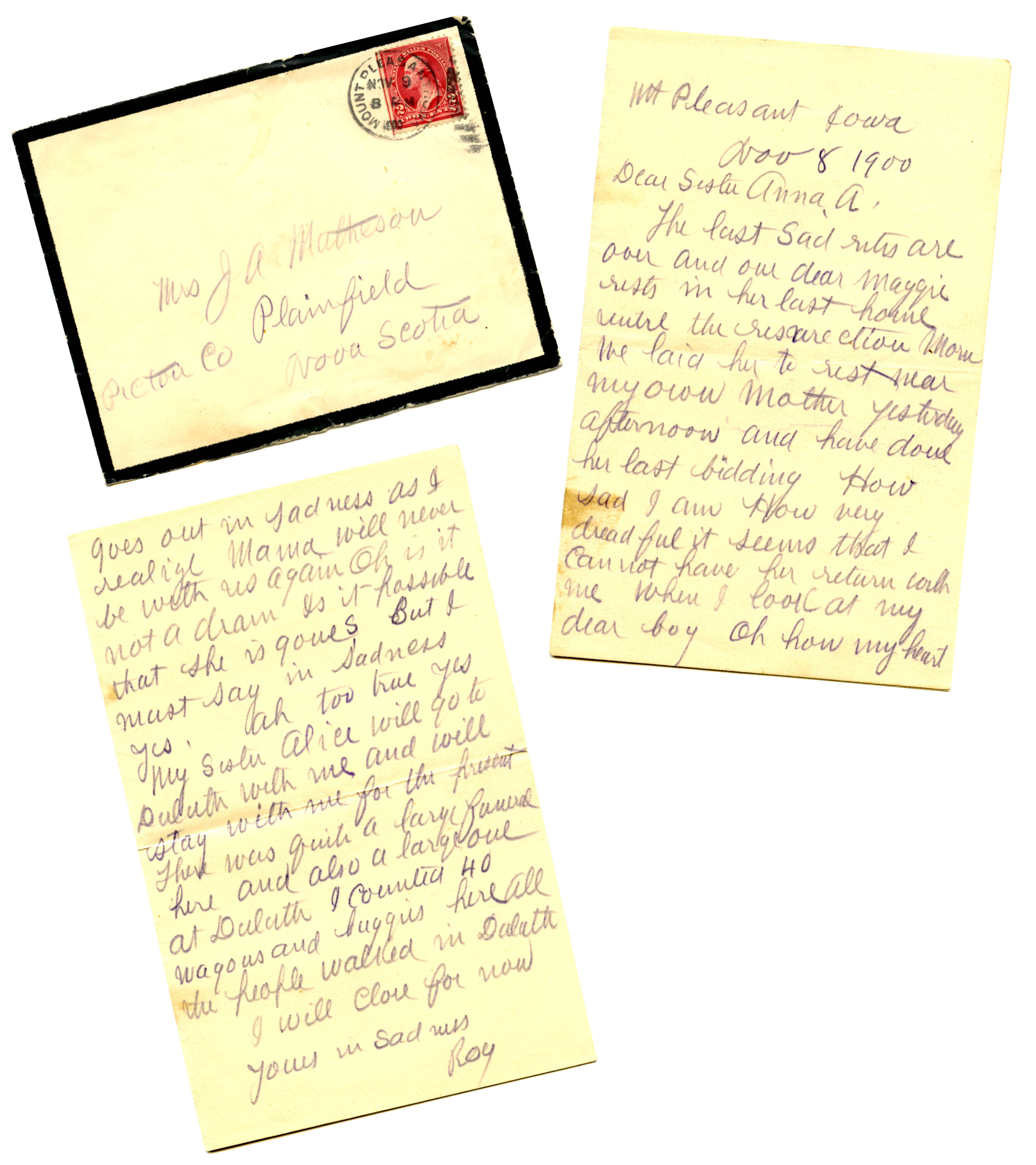 Envelope and letter addressed to Mrs J A Matheson, Plainfield, Pictou Co, Nova Scotia. Postmark Mount Pleasant, Iowa, Nov 9, 8 pm, 1900