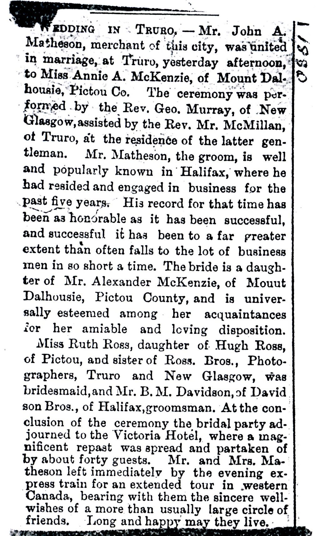 Wedding In Truro - Mr. John A. Matheson, merchant of this city, was united in marriage, at Truro, yesterday afternoon, to Miss Annie A. McKenzie, of Mount Dalhousie, Pictou Co. The ceremony was performed by the Rev. Geo. Murray, of New Glasgow, assisted by the Rev. Mr. McMillan, of Truro, at the residence of the latter gentleman. Mr. Matheson, the groom, is well and popularly known in Halifax, where he had resided and engaged in business for the past five years. His record for that time has been as honorable as it has been successful, and successful it has been to a far greatr extent than often falls to the lot of businesssmen in so short a time. The bride is the daughter of Mr. Alexander McKenzie, of Mount Dalhousie, Pictou County, and is universally esteemed among her acquaintances for her amiable and loving disposition.