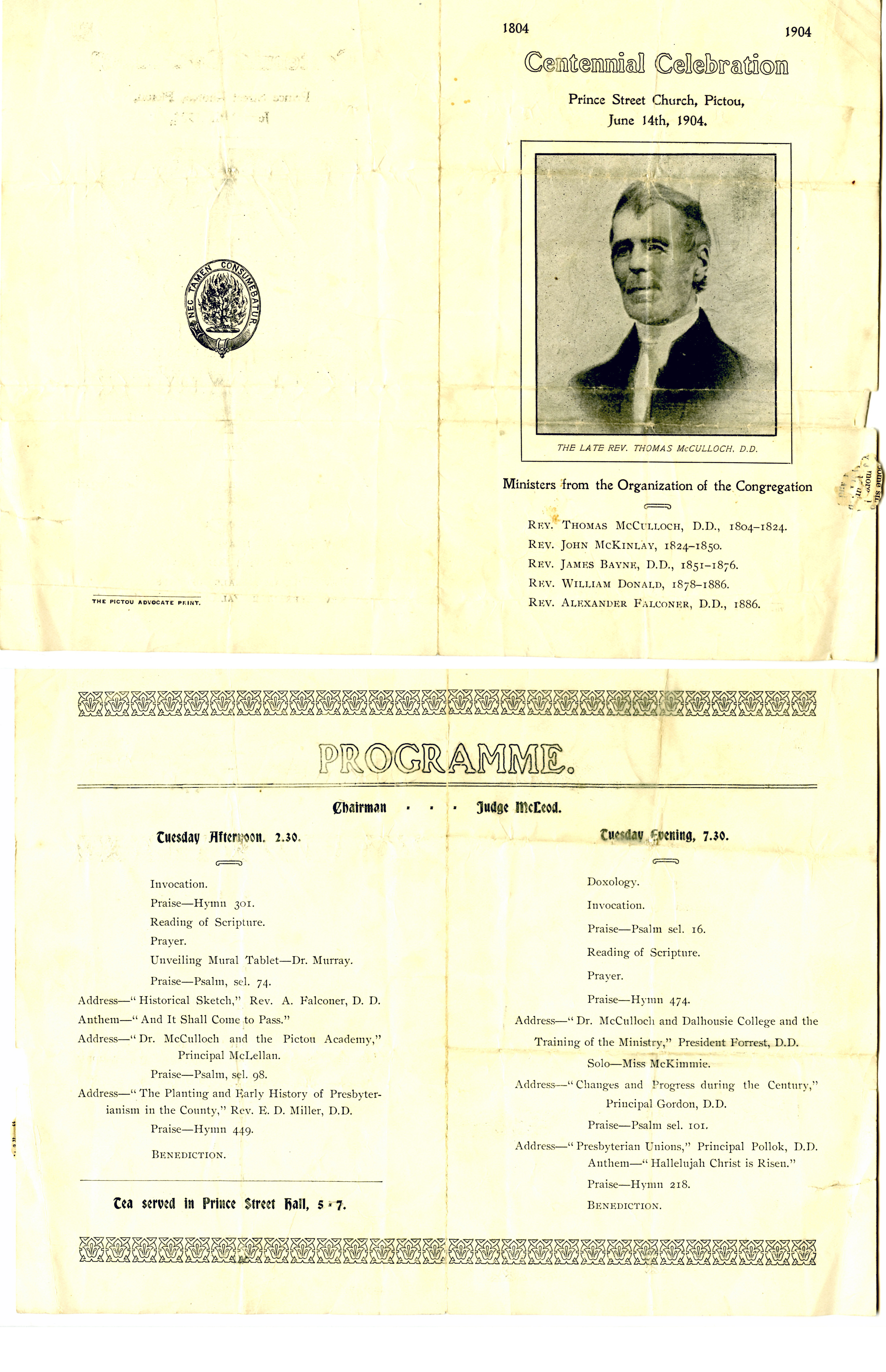 | Tags: | Prince St Church, 1904, Centennial Celebration, Judge McLeod, McKimmie, Principal Gordon D.D., Principal McLellan, Rev. A. Falconer, Rev. E. D. Miller, Pictou Advocate, program, Rev. Thomas McCulloch |