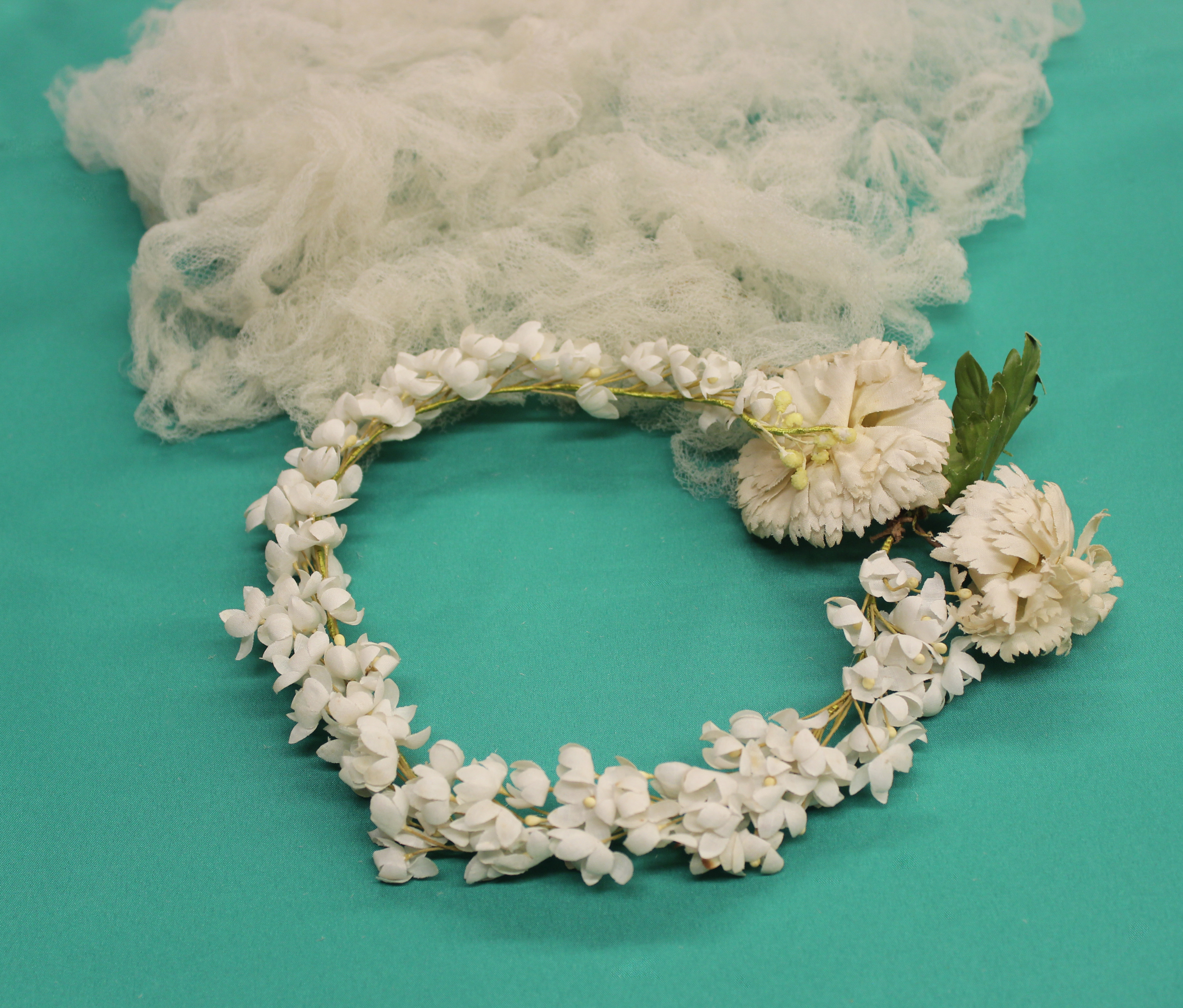 Wedding veil and headband worn by Annie A MacKenzie when she married John A Matheson of Halifax.