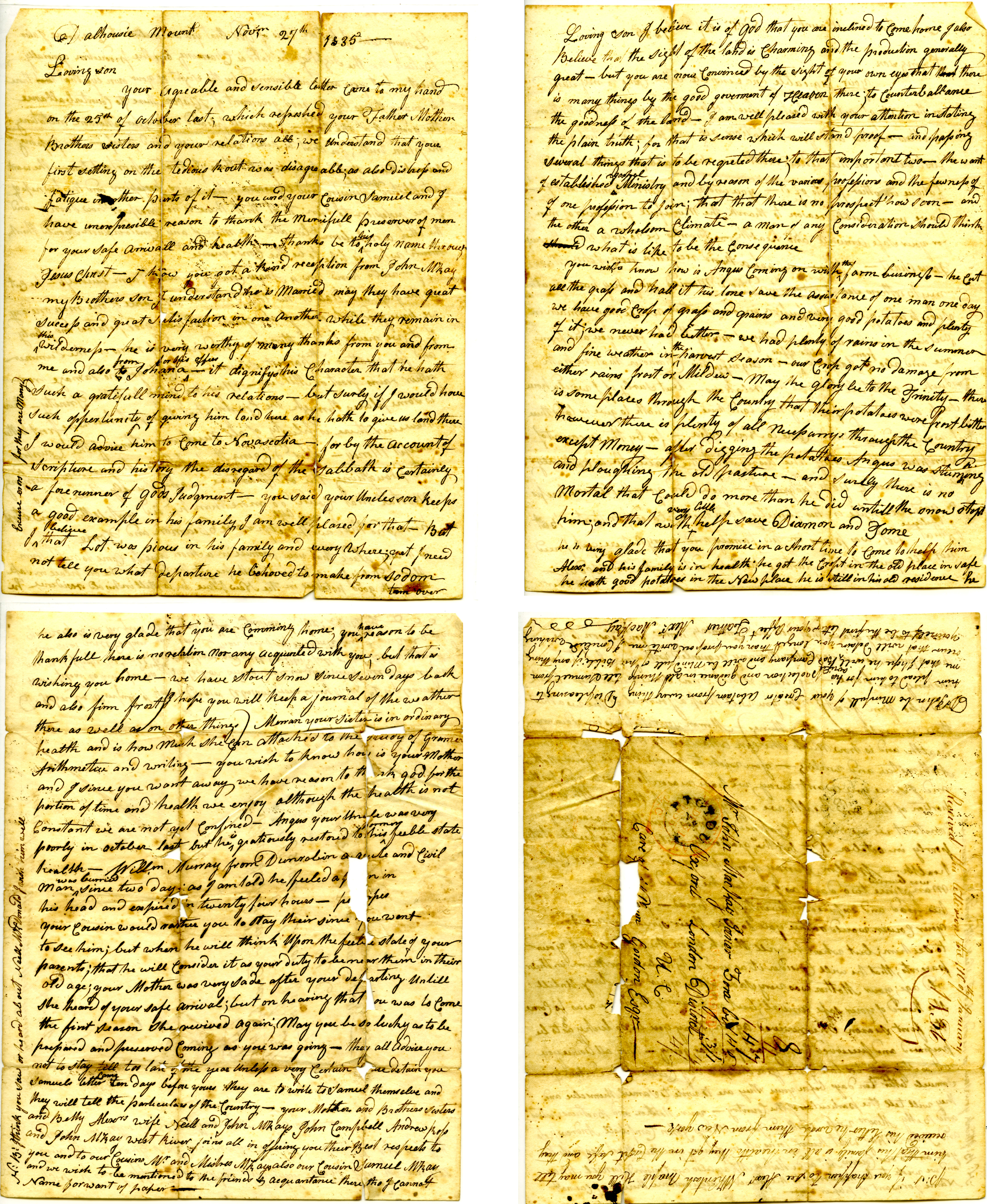 Your agreable and sensible letter came to my hand on the 25th of October last; which refreshed your Father Mother Brothers Sisters and your relations all; we understand that your first setting on the tedious kout* was disagreable; as also distress and fatique in other parts of it_ you and your cousin Samuel and I have --- reason to thank the merciful preserver of men for your safe arrival and health_ thanks to his holy name through Jesus Christ_ I know you got a kind reception from John Mckay my Brothers son I understand he is married may they have great success and great ---faction in one another. While they remain in this wilderness_ he is very worthy of many thanks from you and from me and also from Johana for his offers_ it dignifys his character that he hath such a gratifull mind to his relations_ but surly if I would have such oppertunity of giving him land here as he hath to give us land there I would advise him to come to Nova Scotia_ for by the account of scripture and his Tory the disregard of the sabbath is certainly a forerunner of gods judgement_ you said your Uncles son keeps a good example in his family I am well pleased for that_ but I believe that lot was pious in his family and very where yet I need not tell you what departure he behaved to make from sodom turn over