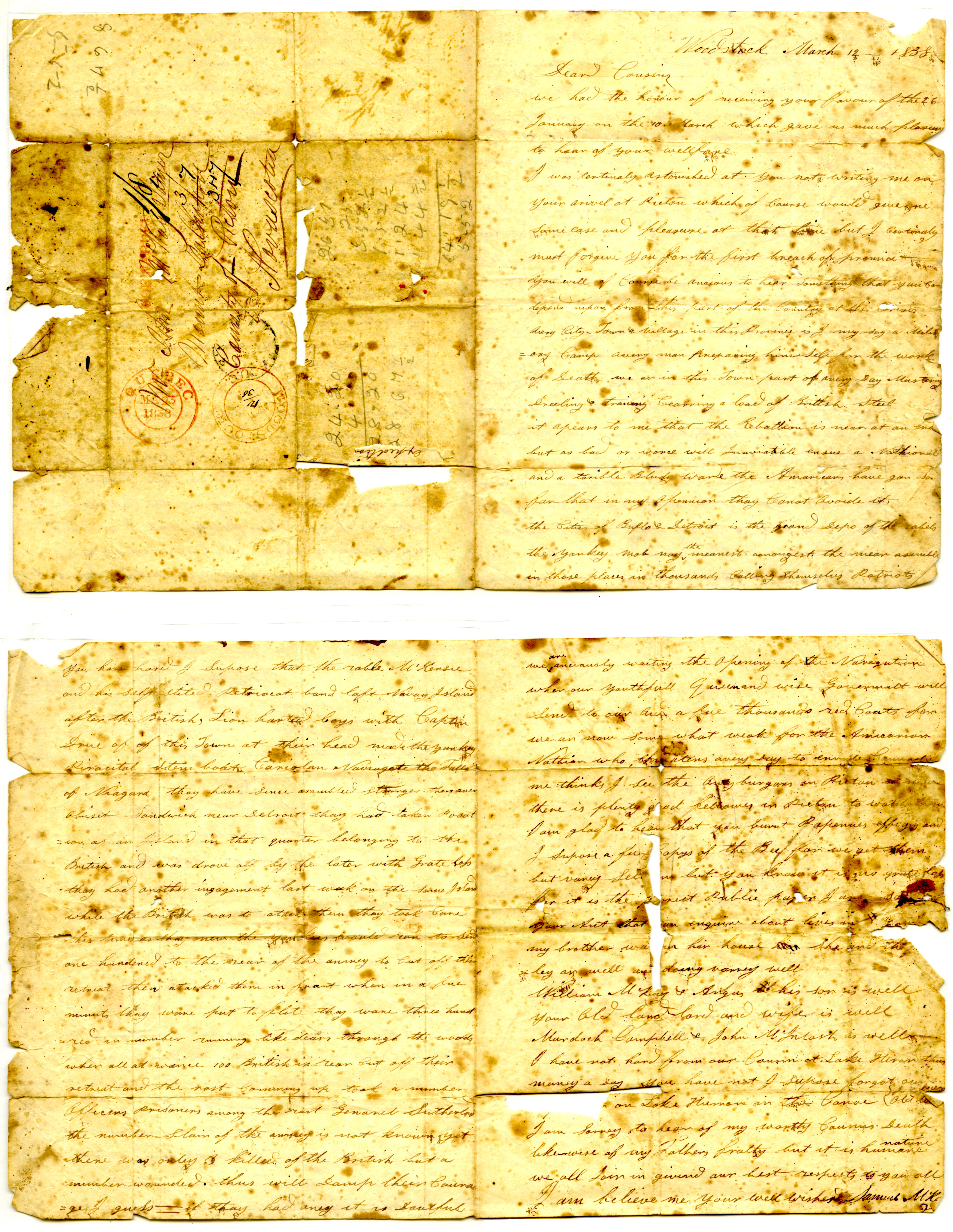 You have heard I suppose that the rebel M'Kenzie and his self (styled) (patriocat) band left Navy Island after the British. Lion hunted boys with Captain Drew of this town at their head made the yankee piratical steamboat Caroline navigate the falls of Niagara. They have since assembled stronger than ever (opposite) Sandwich near Detroit. They had taken possession of an island in that quarter belonging to the British and was drove off by the later with great loss. They had another engagement last week on the same island. While the British was to attack them they took (care) this time as they new the yankees would run to send one hundred to the rear of the army to cut off their retreat then attack them in front when in a few minutes they were put to flight. They were thence hundred in number running like dear through the woods when all at once 100 British in rear cut off their retreat and the rest coming up took a number Officers prisoners among the rest General Sutherland. The number slain of the army is not known yet. There was only (3) killed of the British but a number wounded. This will dampen their courage I guess - if they had any it was doubtful.