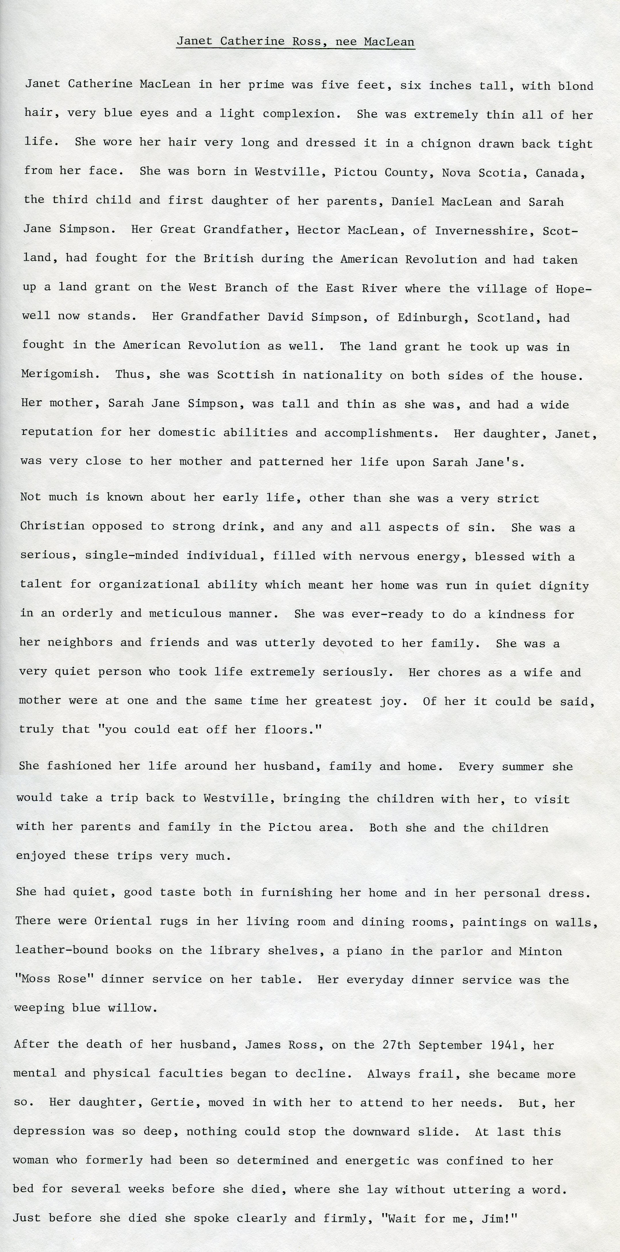 Janet Catherine MacLean in her prime was five feet, six inches tall, with blond hair, very blue eyes and a light complexion. She was extremely thin all of her life. She wore her hair very long and dressed it in a chignon drawn back tight from her face. She was born in Westville, Pictou County, Nova Scotia, Canada, the third child and first daughter of her parents, Daniel MacLean and Sarah Jane Simpson. Her Great Grandfather, Hector MacLean, of Inverness, Scotland, had fought for the British during the American Revolution and had taken up a land grant on the West Branch of the East River where the village of Hopewell now stands. Her Grandfather David Simpson, of Edinburgh, Scotland, had fought in the American Revolution as well. The land grant he took up was in Merigomish. Thus, she was Scottish in nationality on both sides of the house. Her mother, Sarah Jane Simpson, was tall and thin as she was, and had a wide reputation for her domestic abilities and accomplishments. Her daughter, Janet, was very close to her mother and patterned her life upon Sarah Jane's.