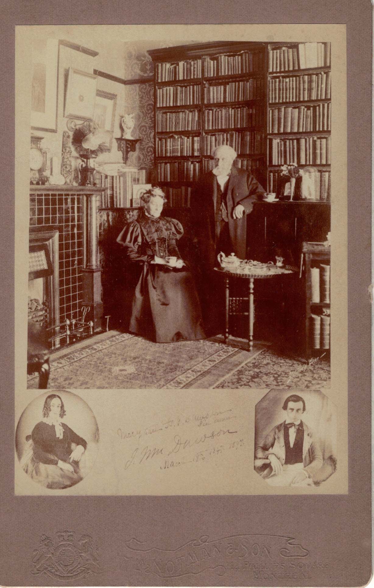 Cabinet card of Lady Margaret and Sir John William Dawson together in their parlour at 293 University Street, Montreal, Quebec and separately in their wedding photos below. Possibly a celebration photo for their golden wedding anniversary.