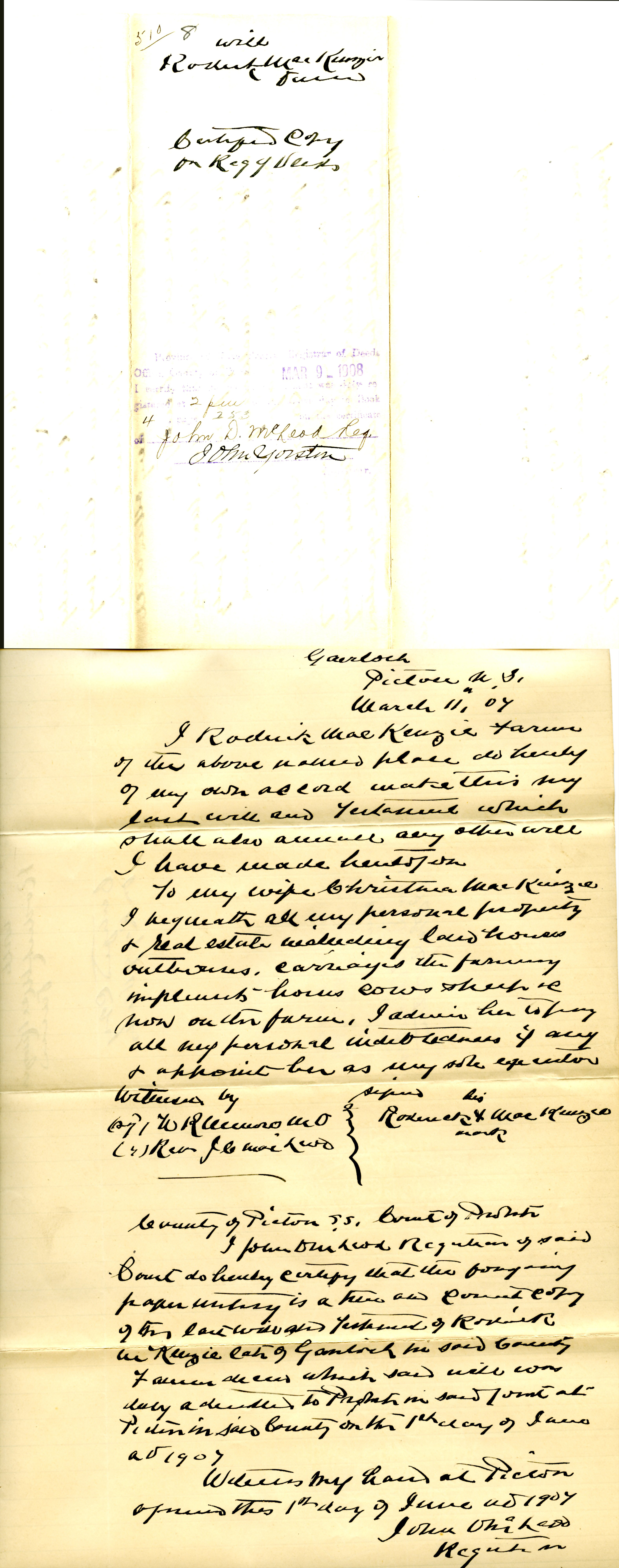 I John D. McLeod Registrar of said Court do hereby certify that the foregoing paper writing is a true copy of the last Will and Testament of Roderick MacKenzie late of Gairloch in the County of Pictou Farmer deceased which said will was duly admitted to Probate in said Court at Pictou on the 1st. day of June AD 1907.