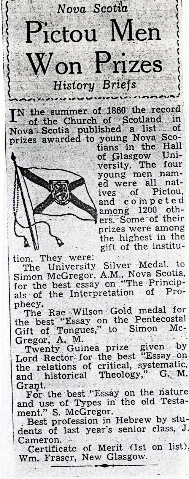 In the summer of 1860 the record of the church of Scotland in Nova Scotia published a list of prizes awarded to young Nova Scotians in the hall of Glasgow University. The four young men named were all natives of Pictou , and competed among 1200 others. some of their prizes were among the highest in the gift of the institution. they were :