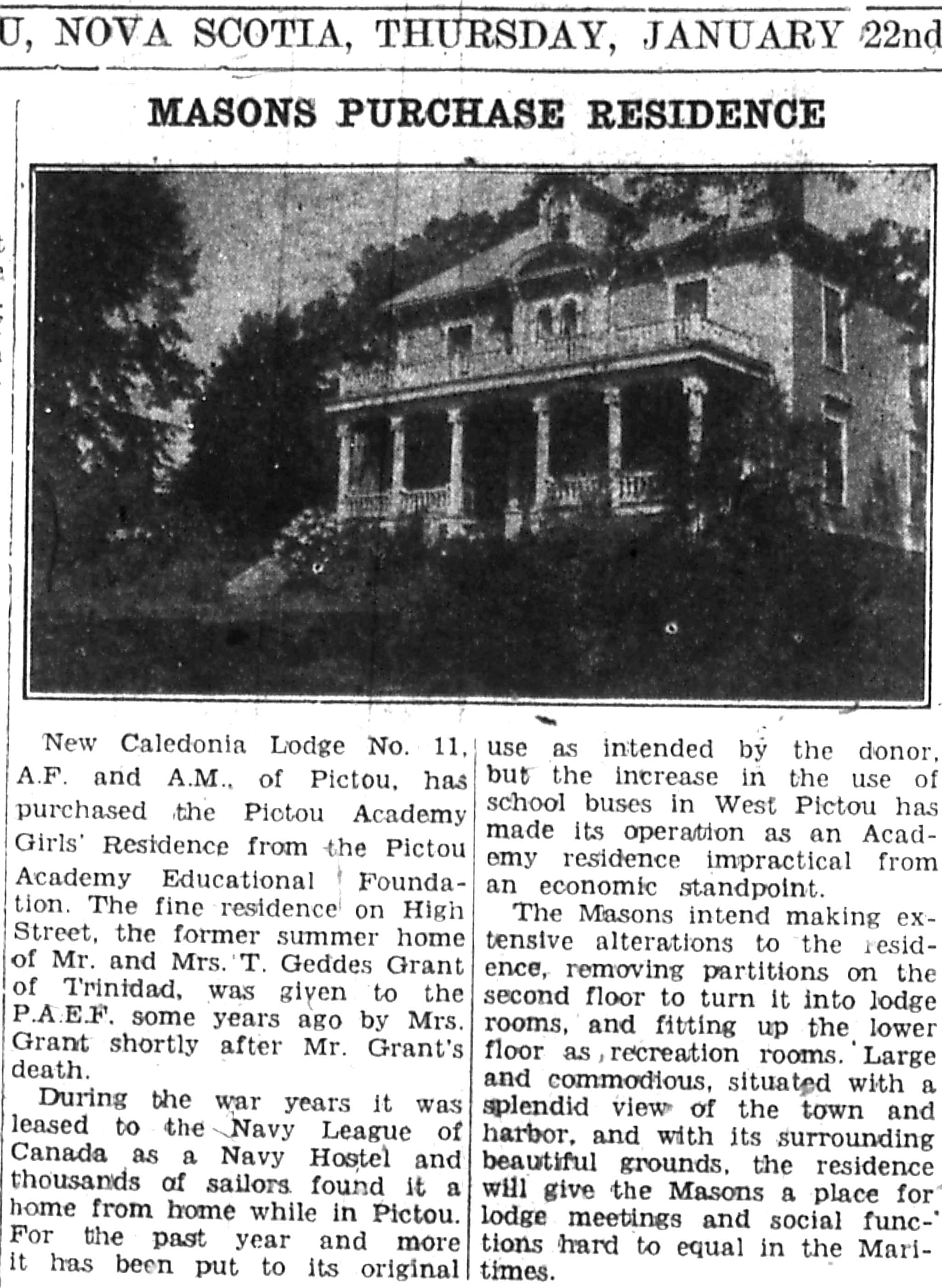 New Caledonia Lodge No. 11, A.F. and A.M. of Pictou, has purchased the Pictou Academy Girls' Residence from the Pictou Academy Educational Foundation. The fine residence on High Street, the former summer home of Mr. and Mrs. T. Geddes Grant of Trinidad, was give to the P.A.E.F. some years ago by Mrs. Grant shortly after Mr. Grant's death.