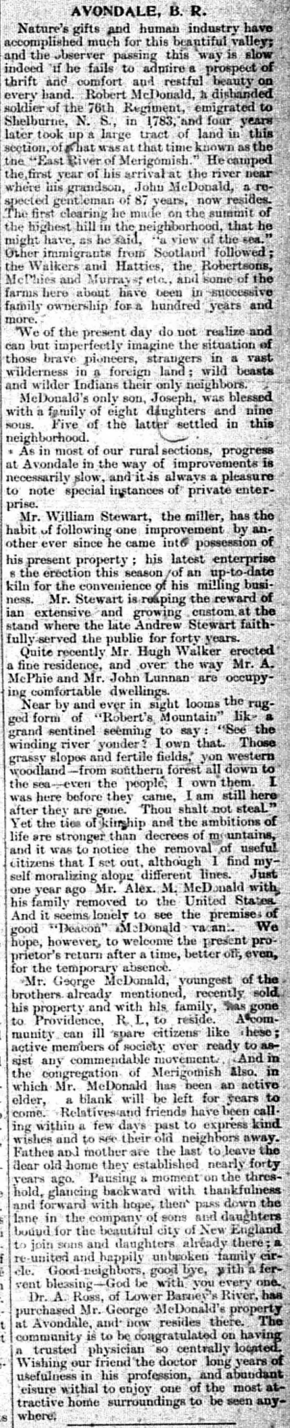 Dr. A. Ross, of Lower Barney's River has purchased Mr. George McDonald's property at Avondale, and now resides there. The community is to be congratulated on having a trusted physician so centrally located. Wishing our friend the doctor long years of usefulness in his profession, and abundant leisure withal to enjoy one of the most attractive home surroundings to be seen anywhere.