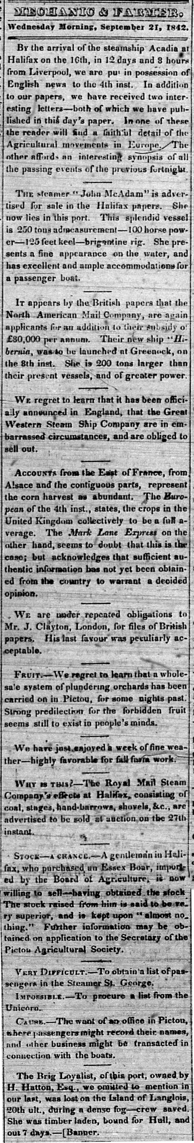 By arrival of the steamship Acadia at Halifax on the 16th, in 12 days and 8 hours from Liverpool, we are put in possession of English news to the inst. In addition to our papers, we have received two interesting letters - both of which we have published in this day's paper. In one of these the reader will find a faithful detail of the Agricultural movements in Europe. The other affords an interesting synopsis of all the passing events of the previous fortnight.