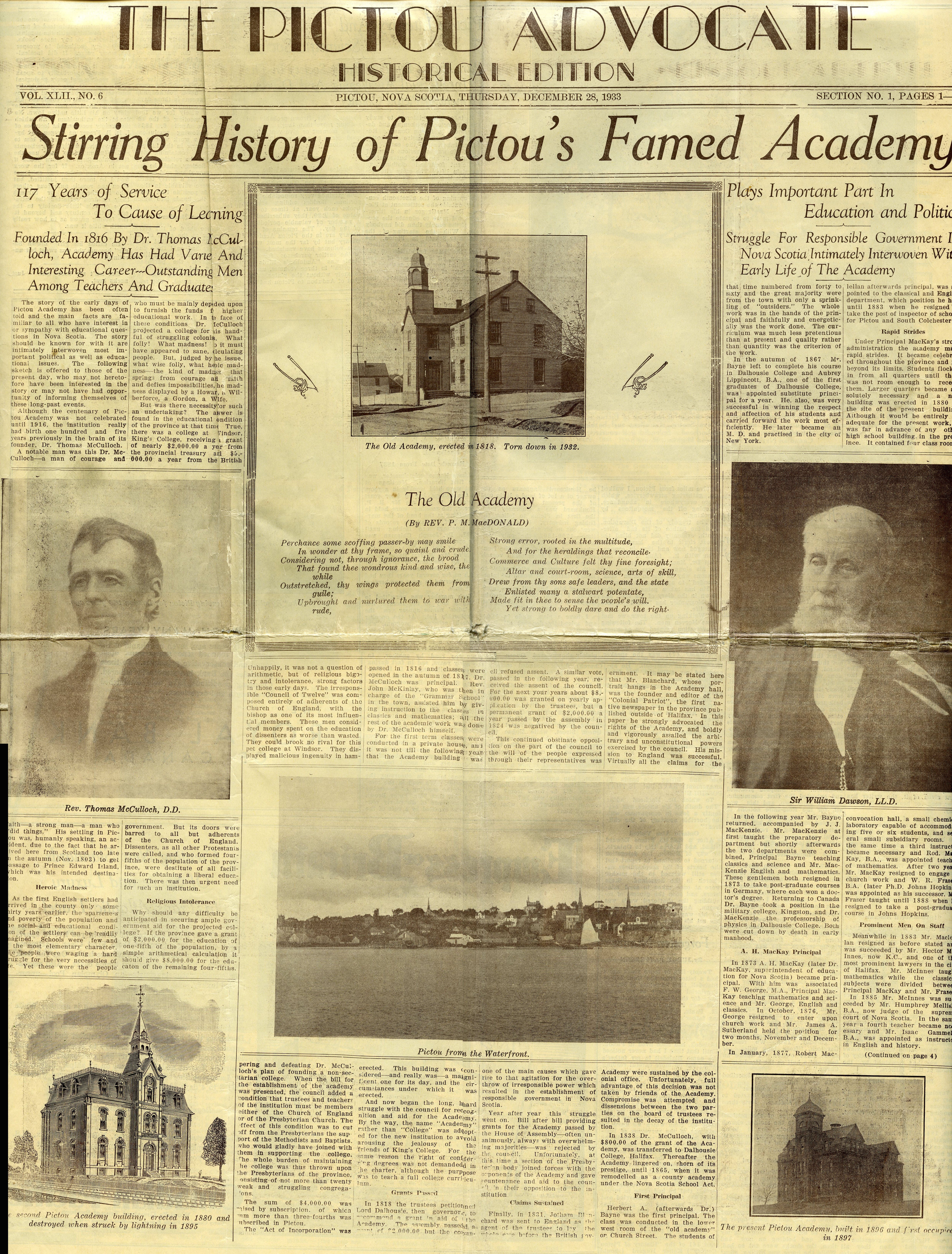 The Old Pictou Academy (article below the photo of the First Pictou Academy)