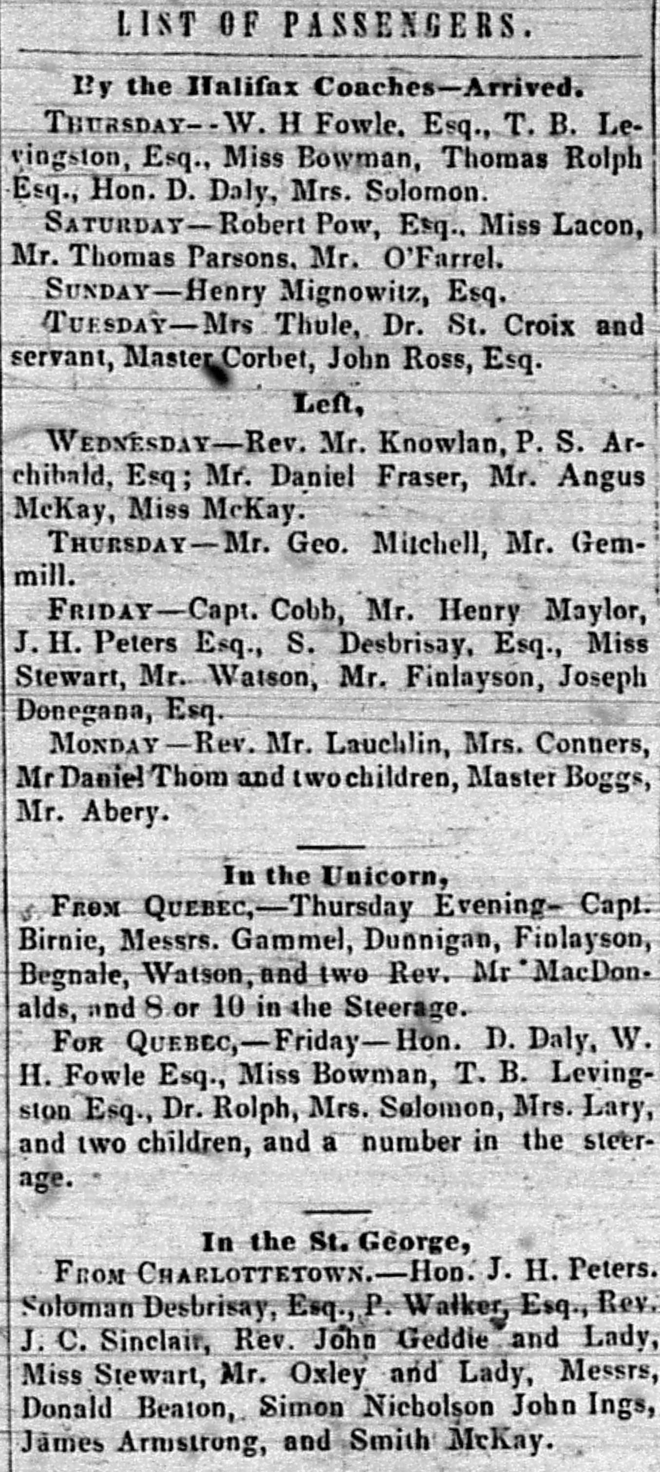| Tags: | arrived, cleared, coach, Bowman, Fowle, Levingston, Bowman, Rolph, Solomon, Pow, Lacon, Parsons, O'Farrel, Mignowitz, Thule, St Croix, Corbet, Ross, Knowlan, Archibald, Fraser, McKay, Esquire, Mitchell, Gemmill, Captain Cobb, Henry Maylor, Peters, Desbrisay, Stewart, Watson, Finlayson, Donegana, Lauchlin, Conners, Thom, Boggs, Abery, Unicorn, Captain Birnie, Gammel, Dunningan, Begnale, Rev MacDonald, Daly, Lary, St. George, Peters, Walker, Sinclair, Geddie, Oxley, Beaton, Nicholson, Ings, Armstrong, McKay, passengers, Quebec, Charlottetown, Halifax |