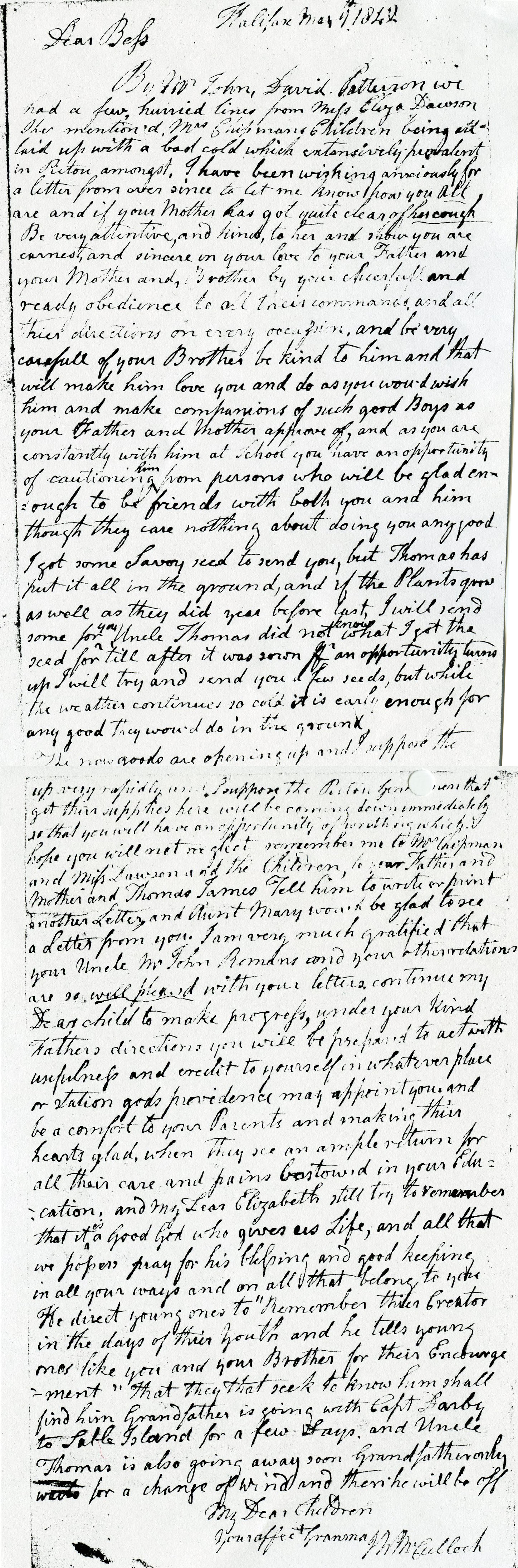 The now goods are opening up and I suppose the up very rapidly and suppose the Pictou gentleman that get their supplies here will be coming down immediately so that you will have an opportunity of writing which hope you will not neglect remember me to Mrs. Chipman and miss Dawson and the children, to your father and mother and Thomas James tell him to write or print another letter and Aunt Mary would be glad to see a letter from you. I am very much gratified that your Uncle Mr. John Romans and your other relations are so well pleased with your letters continue my dear child to make progress , under your kind fathers directions you will be prepared to act with *** and credit to yourself in whatever place or station gods providence may appoint you and be comfort to your Parents and making their hearts glad, when they see an ample return for all their care and pains bestowed in your Education , and my dear Elizabeth still try to remember that it is a good god who gives us life , and all that we proper pray for his helping and good keeping in all your ways and on all that belong to you He direct young ones to “Remember their creator in the days of their youth and he tells young like you and your bother for their Encourage -ment” That they that seek to know him shall find him Grandfather is going with Capt.Larby to Sable Island for a few days and Uncle Thomas is also going away soon Grandfather only waits for a change of wind and then he will be off.